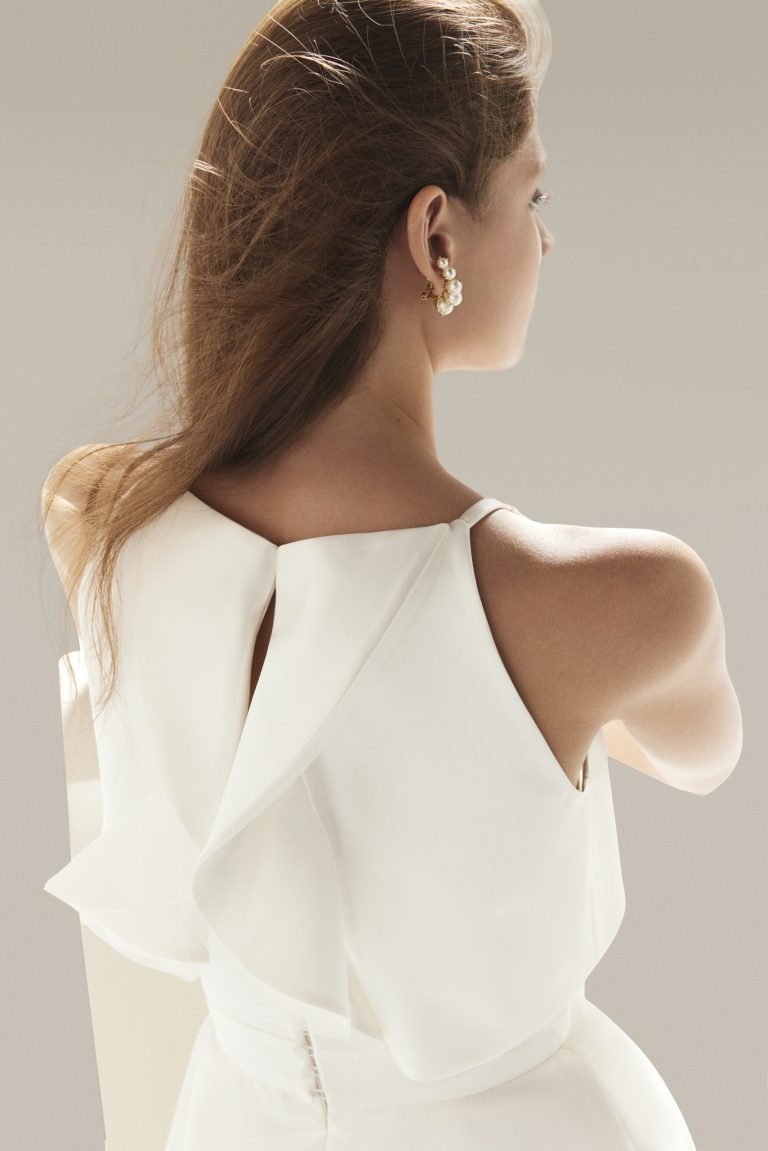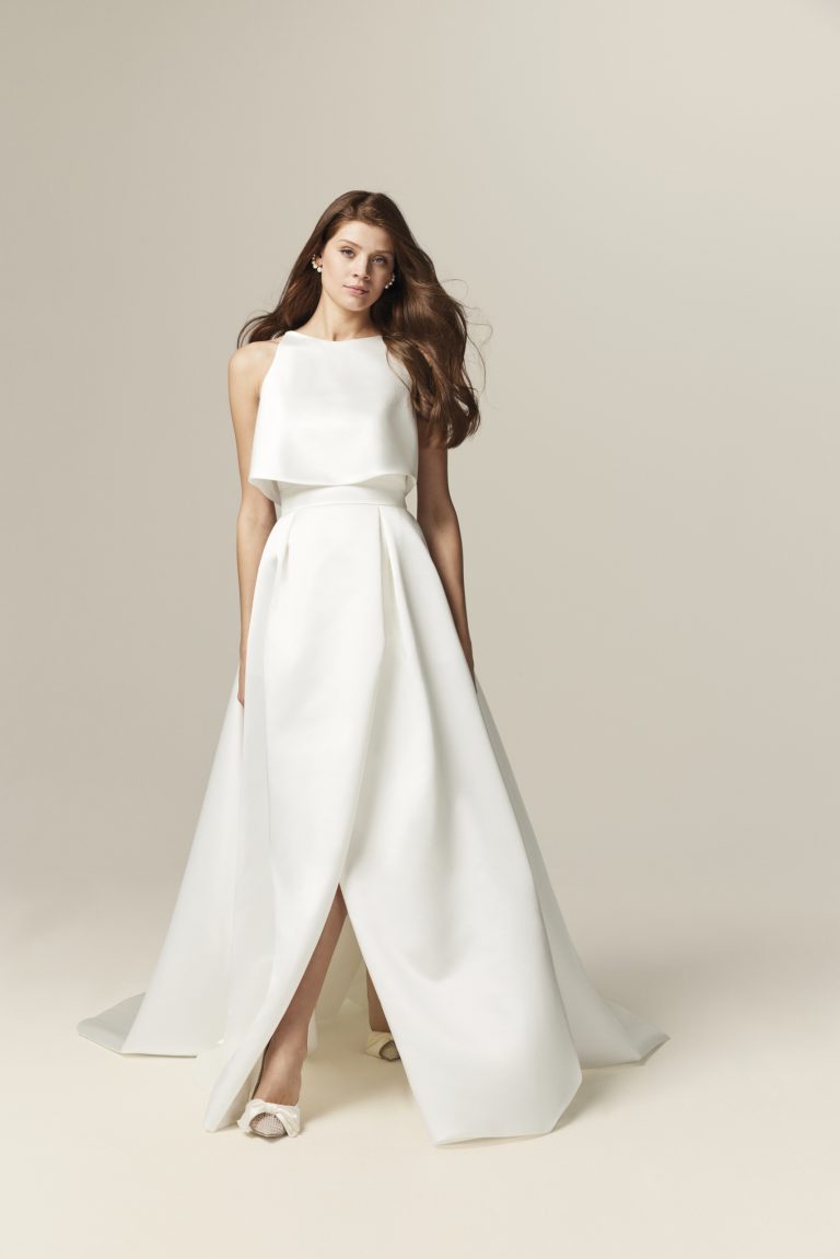 Magnifico vestito da sposa a due pezzi in raso. Abito decolleté con gonna incrociata con apertura. Top con piccoli volant arricciati.