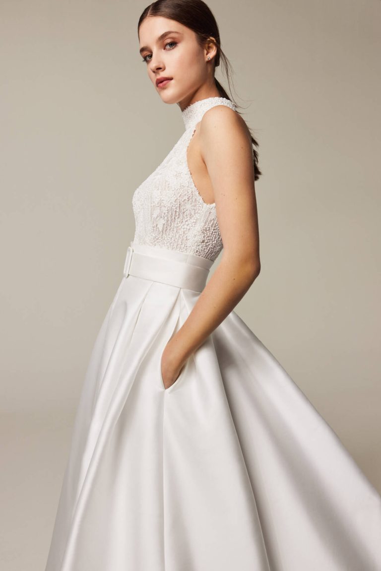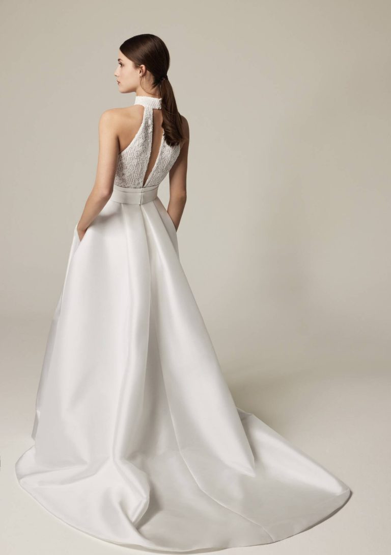 2504: Grande volume abbinando tulle ricamato e taffetà mikado. Body dolce vita con giromanica all’americana in fantasia; gonna ad apertura centrale con cintura.