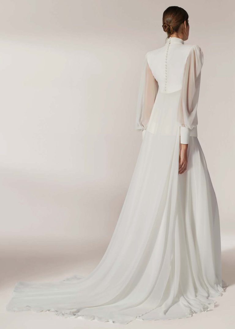 Corpetto in crêpe e gonna in chiffon, il modello 2600 è un abito da sposa d’alta moda che veste le nuove tendenze.