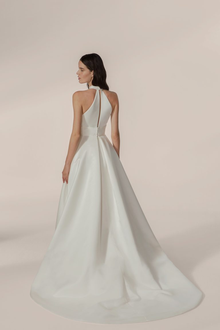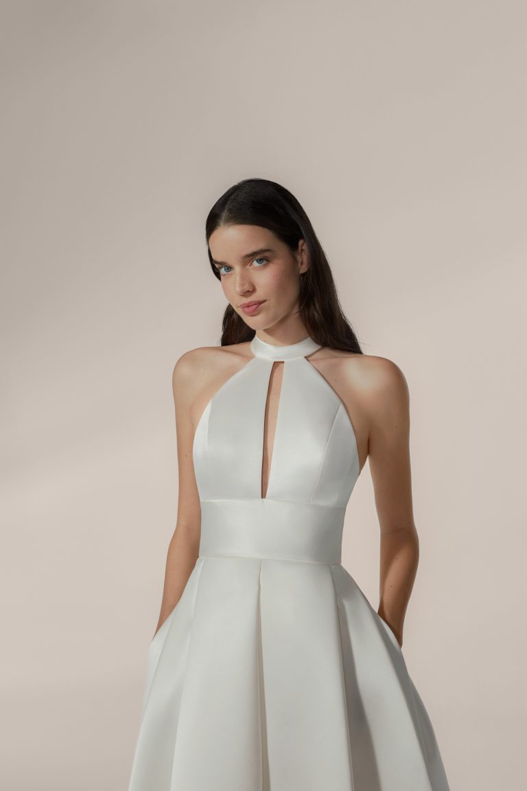 Abito molto vaporoso con giromanica all’americana e colletto in raso. Apertura nella gonna.