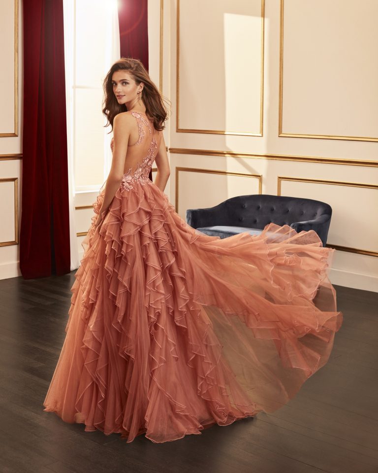 Abito da cerimonia in pizzo con tulle. Scollo a V, gonna con volant.