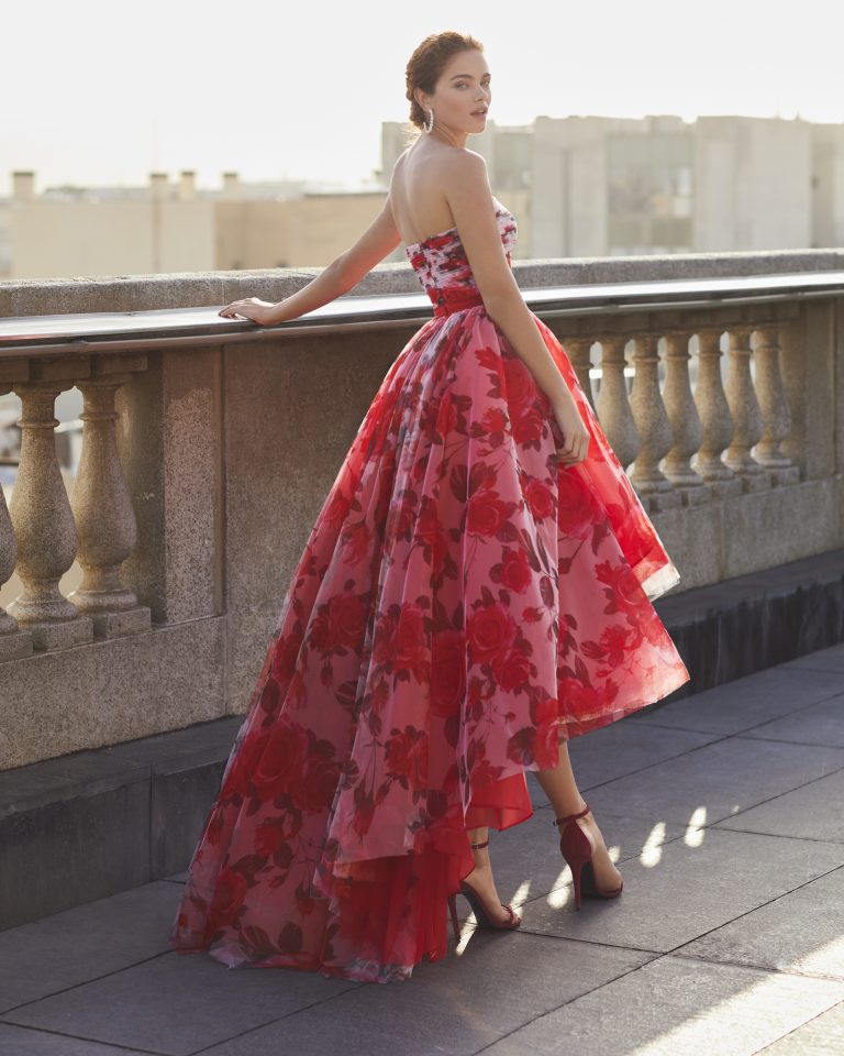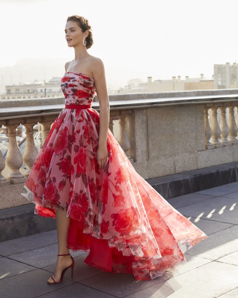 Abito da cerimonia in tulle stampato, con cintura sottile e liscia di colore rosso. Degna di nota la modellistica alla moda e giovanile.