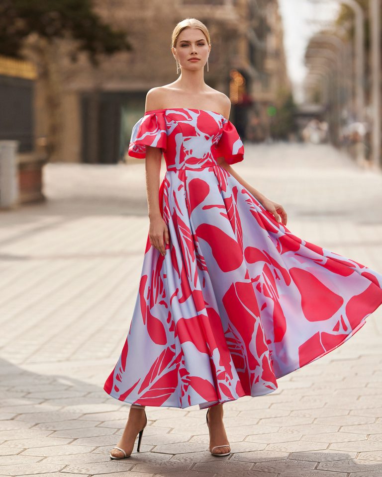Abito da cerimonia confezionato in mikado stampato. Modello Marfil Barcellona con scollo senza spalline e maniche corte.