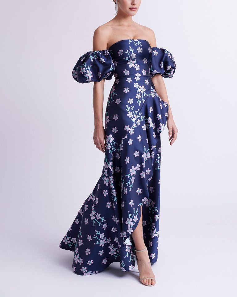 Abito da cerimonia redingote lungo con motivi floreali, confezionato in broccato, con gonna asimmetrica con volant. Modello Rosa Clará Cocktail con scollo senza spalline e schiena scollata, con maniche a sbuffo.