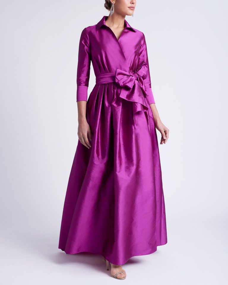 Modello di Rosa Clará Cocktail, caratterizzato da uno scollo chemisier incrociato e schiena coperta, con maniche francesi e chiusura con bottone gioiello.