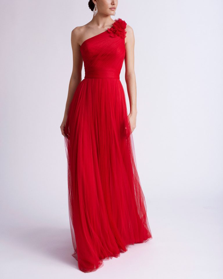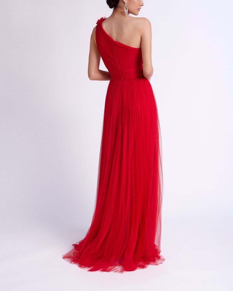 Abito da cerimonia elegante confezionato in tulle morbido con stola abbinata. Modello di Aire Barcelona, con scollo asimmetrico e fiore ornamentale sulla spalla.