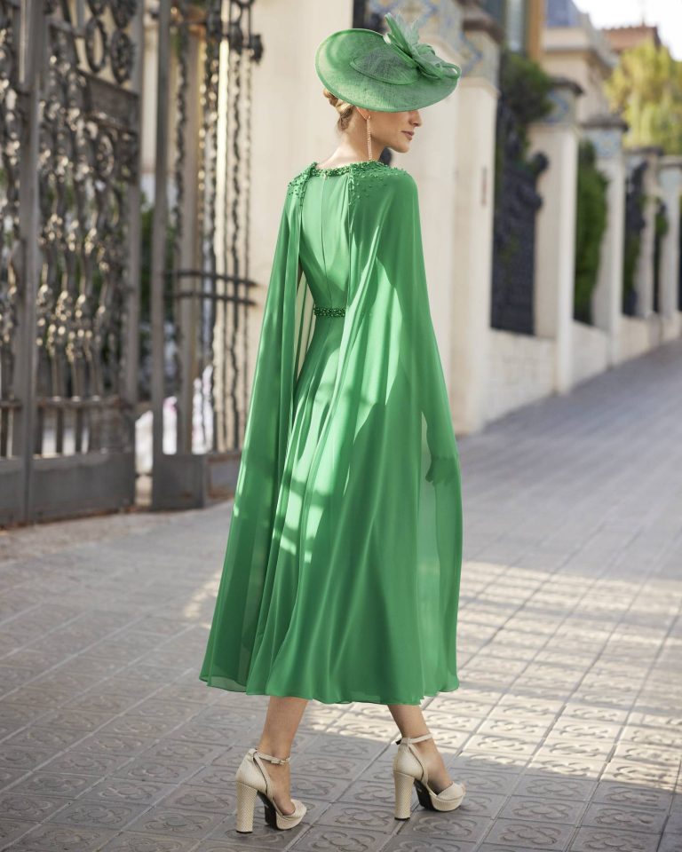 Abito da invitata midi elegante. Realizzato in georgette impreziosito da strass. Con scollo rotondo, schiena coperta e maniche a mantella. Modello Couture Club per cerimonie ed eventi.