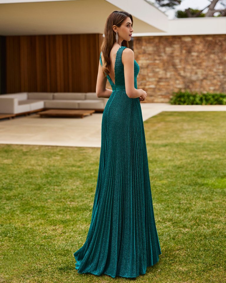 Abito da cocktail lungo in lurex con dettagli di strass. Con scollo e schiena a V.