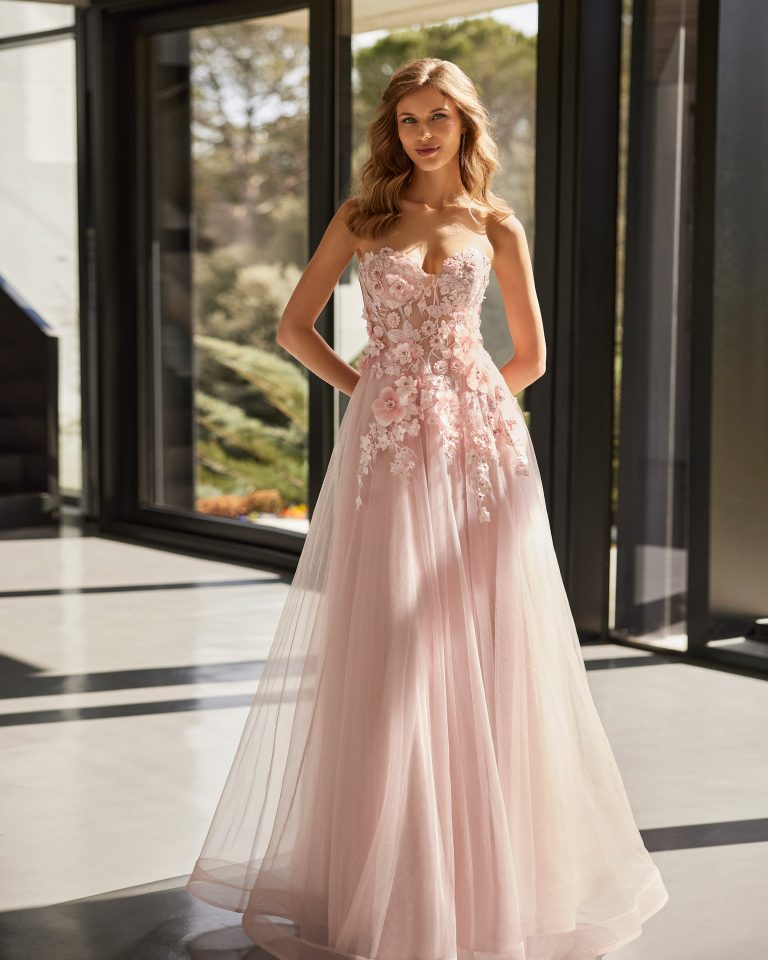Abito lungo in stile romantico. Realizzato in tulle impreziosito da pizzo e strass. Con scollatura dritta e schiena a corsetto con maniche a sbuffo rimovibili.