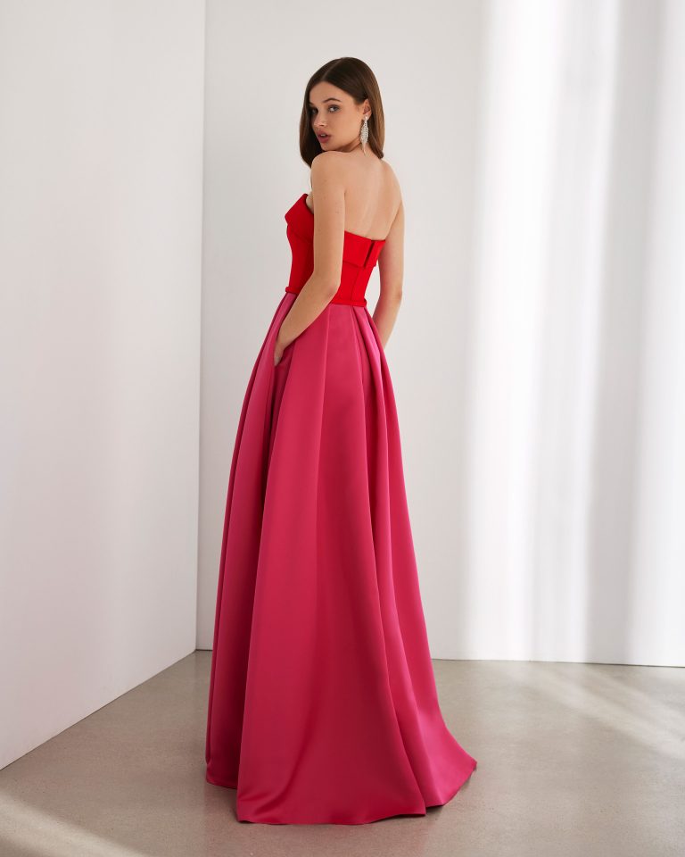 Abito da cocktail lungo ed elegante realizzato in raso. Con scollo senza spalline e gonna con le tasche. Modello Rosa Clará Cocktail per cerimonie ed eventi.