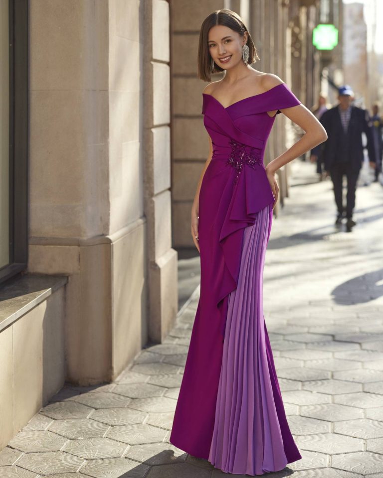 Abito da cerimonia lungo realizzato in crêpe satin con applicazioni di strass. Con scollo off-shoulders e stola. Un look Marfil Barcelona.