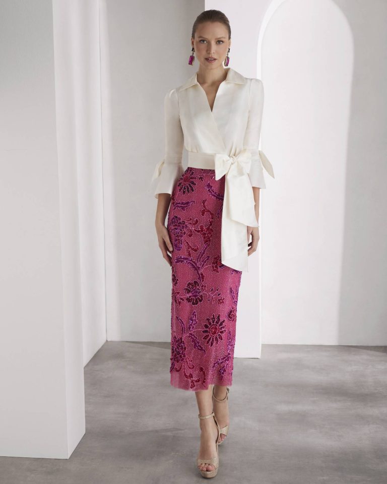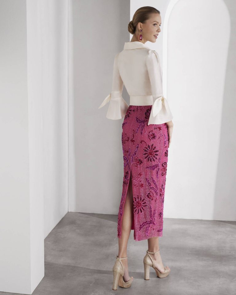 Abito da cerimonia confezionato in raso real con applicazioni di strass e ricami. Con collo chemisier, schiena chiusa e maniche lunghe e una fusciacca con fiocco irregolare. Un look Rosa Clará Cocktail.