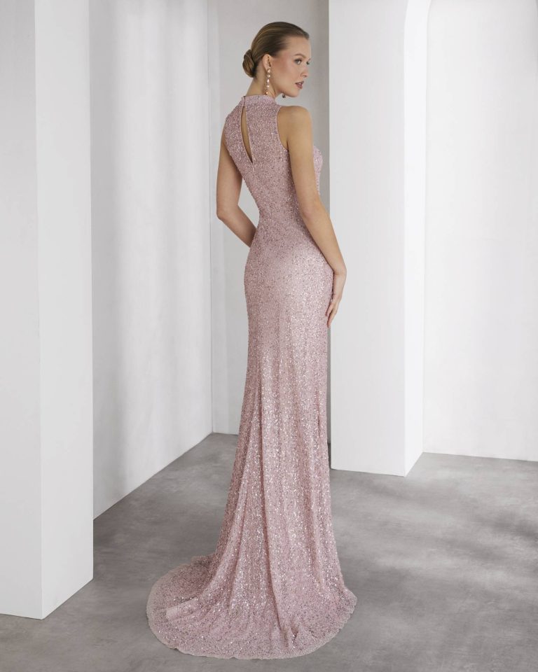 Abito da cerimonia lungo realizzato con paillettes. Il corpetto mostra uno scollo all’americana, apertura a goccia sulla schiena ed è senza maniche. Un look Rosa Clará Cocktail.