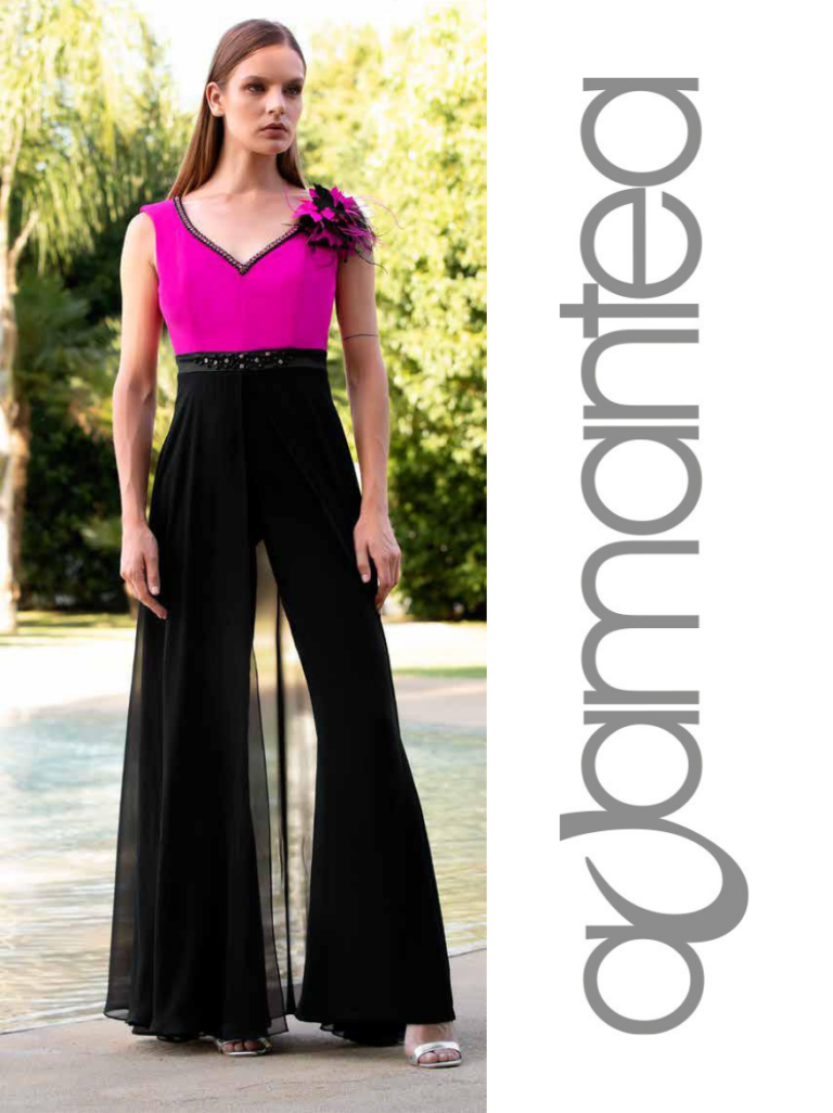 Jumpsuit cerimonia bicolor con corpino fucsia decorato da applicazione floreale sulla spalla e scollo rifinito con perline nere. La parte inferiore presenta un elegante pantalone palazzo nero con pannelli chiffon e cintura con dettagli gioiello. Perfetta per invitata, damigella o eventi serali, dona un look glamour e sofisticato.