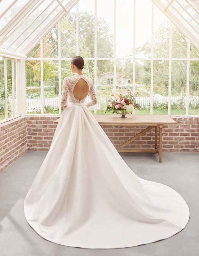 Questo abito da sposa due pezzi ti farà innamorare. Il suo design prevede una sopragonna in Mikado e un abito corto con maniche lunghe e collo alto realizzato interamente in Guipure.