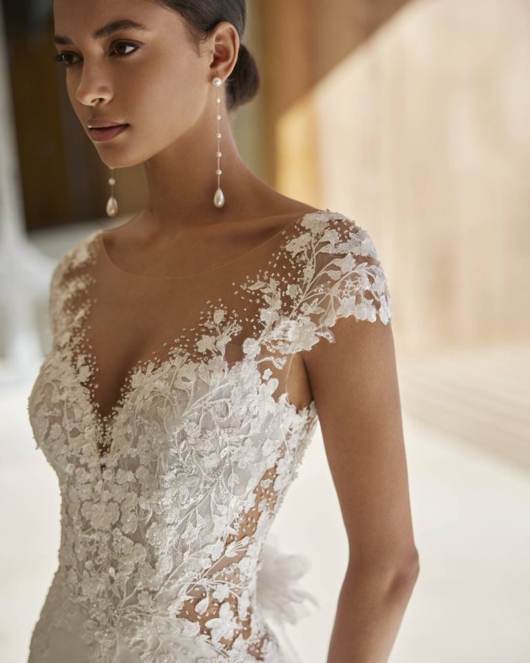 Sensuale abito da sposa sirena confezionato in crêpe elasticizzato, pizzo e strass e composto da due pezzi. Presenta uno scollo a cuore, schiena a V, maniche corte e strascico in pizzo e strass. Infine, completa l’abito uno strascico in tulle removibile. Un abito da sogno Rosa Clará.
