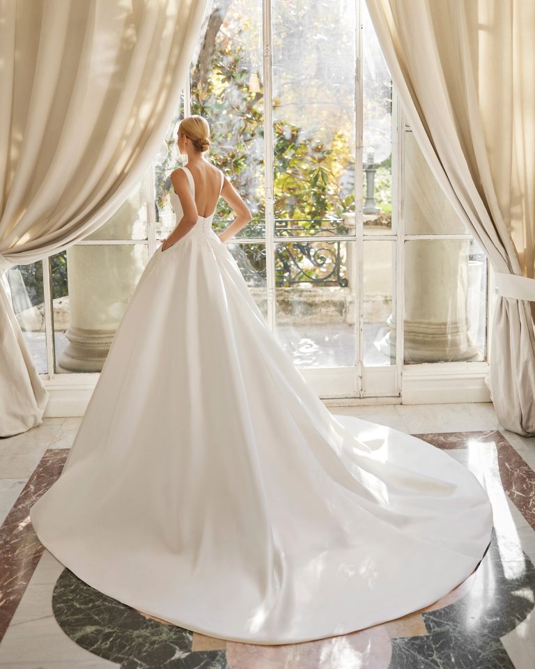 Abito da sposa redingote classico; realizzato in mikado e caratterizzato da inserti di pizzo con strass sul corpetto e sulla gonna, scollo quadrato e schiena scoperta.