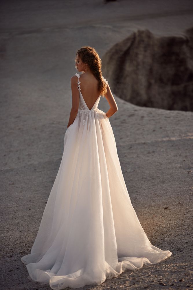 Abito da sposa da sogno con spalline adornate da fiori volumetrici. L’abito è sontuosamente elegante con glitter e fiori 3D. Presenta un profondo scollo a V, schiena a V e strascico midi.
