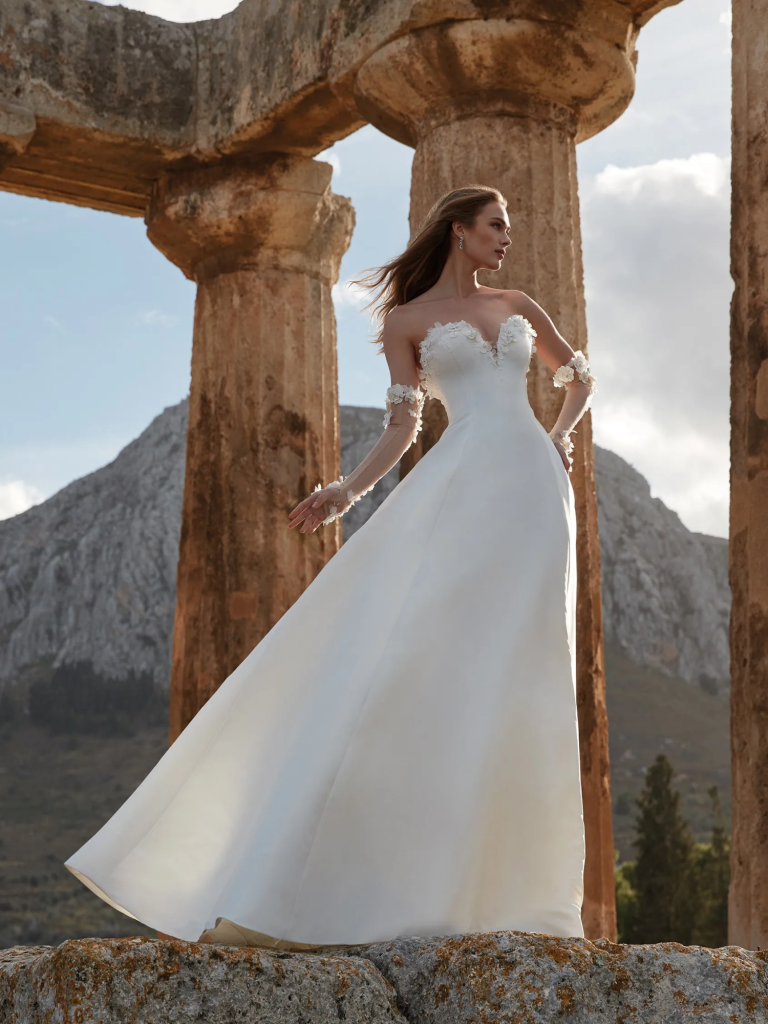 Abito da sposa in mikado con scollo a cuore e applicazioni floreali ricamate. La gonna ampia e strutturata esalta la silhouette con eleganza regale, mentre il corpetto pulito e senza spalline dona un tocco moderno e sofisticato. Perfetto per la sposa che desidera un look essenziale, romantico e di grande impatto.