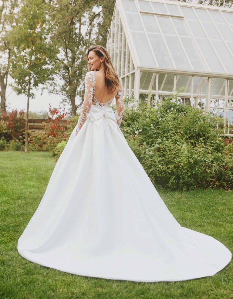 Questo abito da principessa dai volumi ampi è caratterizzato da un corpetto aderente con scollatura a V che si apre nella gonna realizzata in mikado e sublimata da un fiocco, creando la sensazione di un abito a due pezzi.