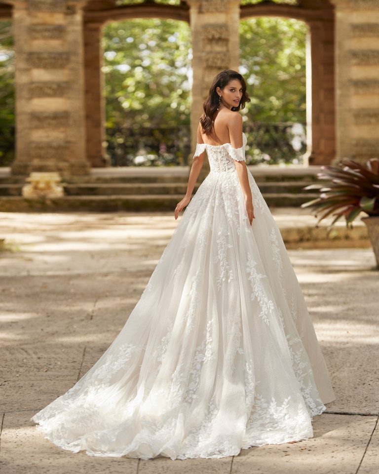 Abito da sposa d’alta moda confezionato in tulle pregiato e impreziosito da pizzo e strass. Beria presenta uno scollo senza spalline, schiena scoperta con spalline scese e gonna con tulle e paillettes.