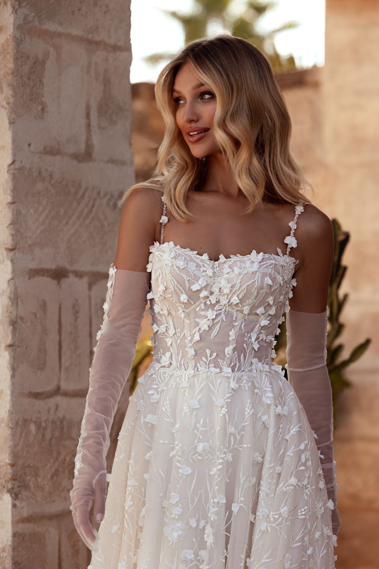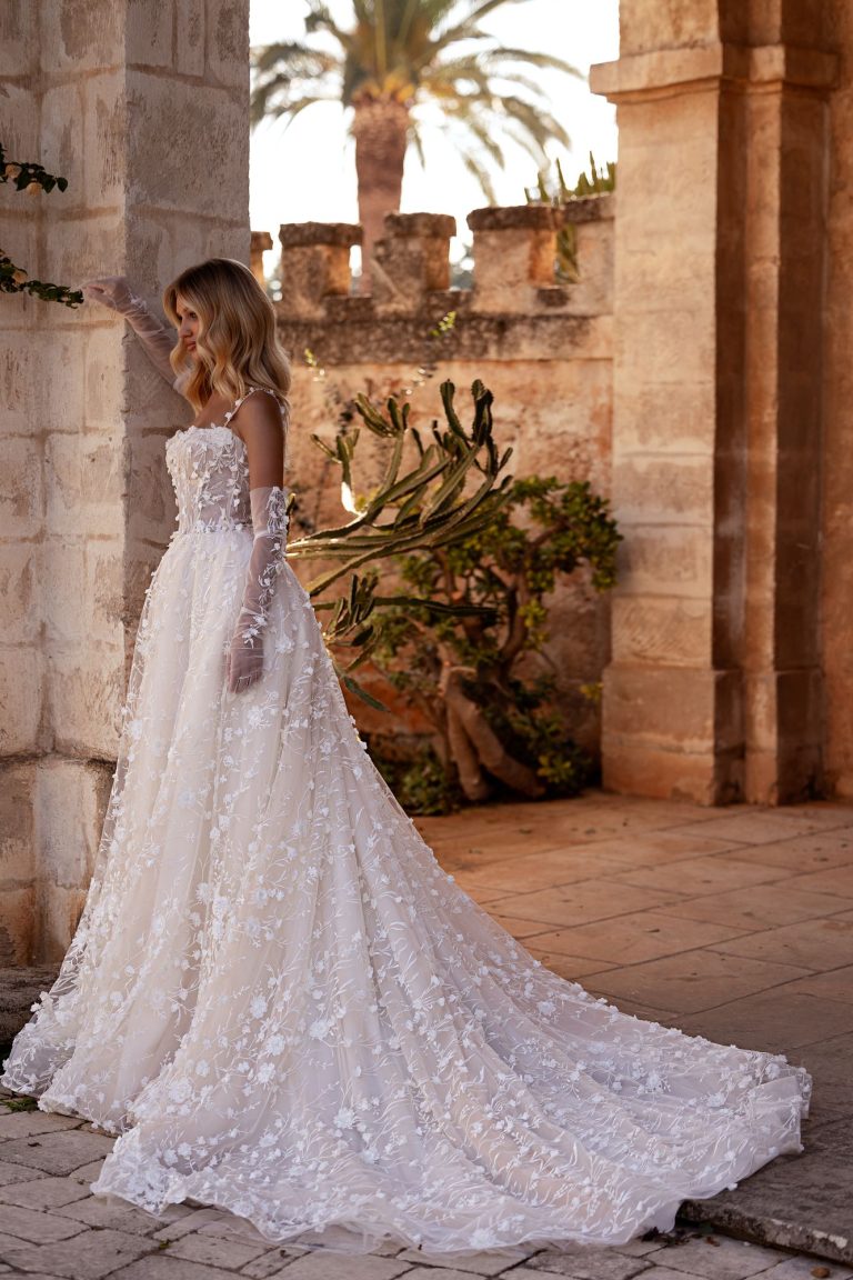 L’abito Bette Davis è un trionfo di pizzi applicati e ricamati. Il corsetto presenta spalline sottili impreziosite da delicate foglioline di pizzo e perline.