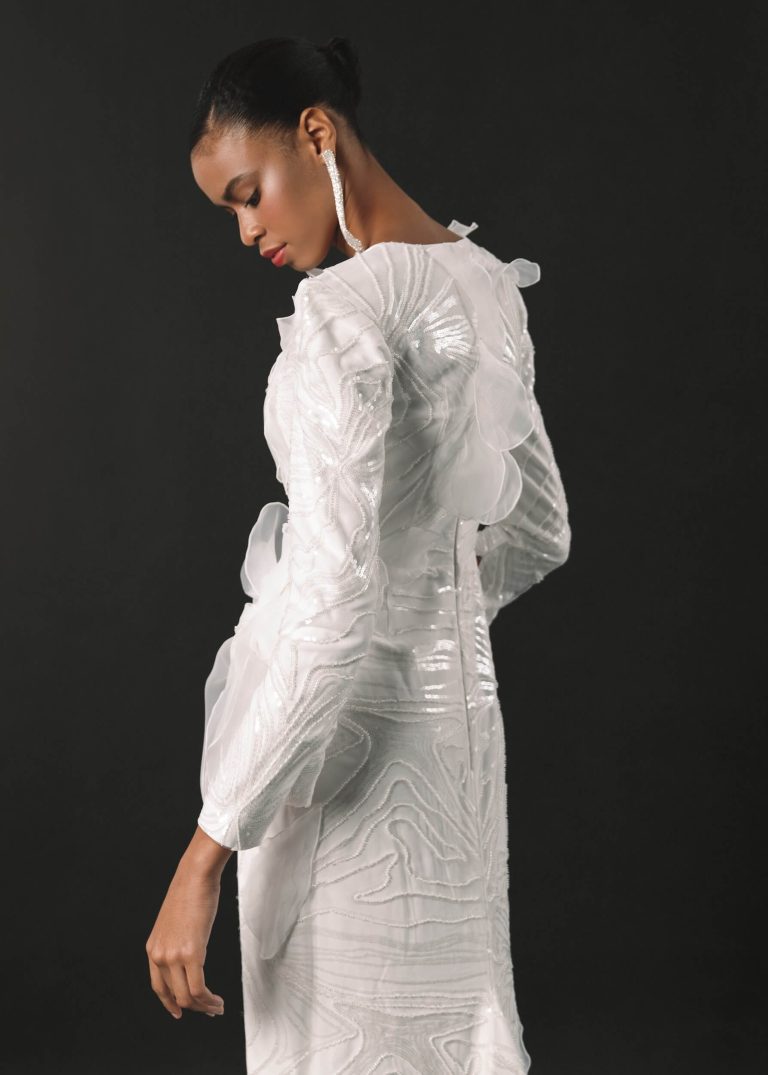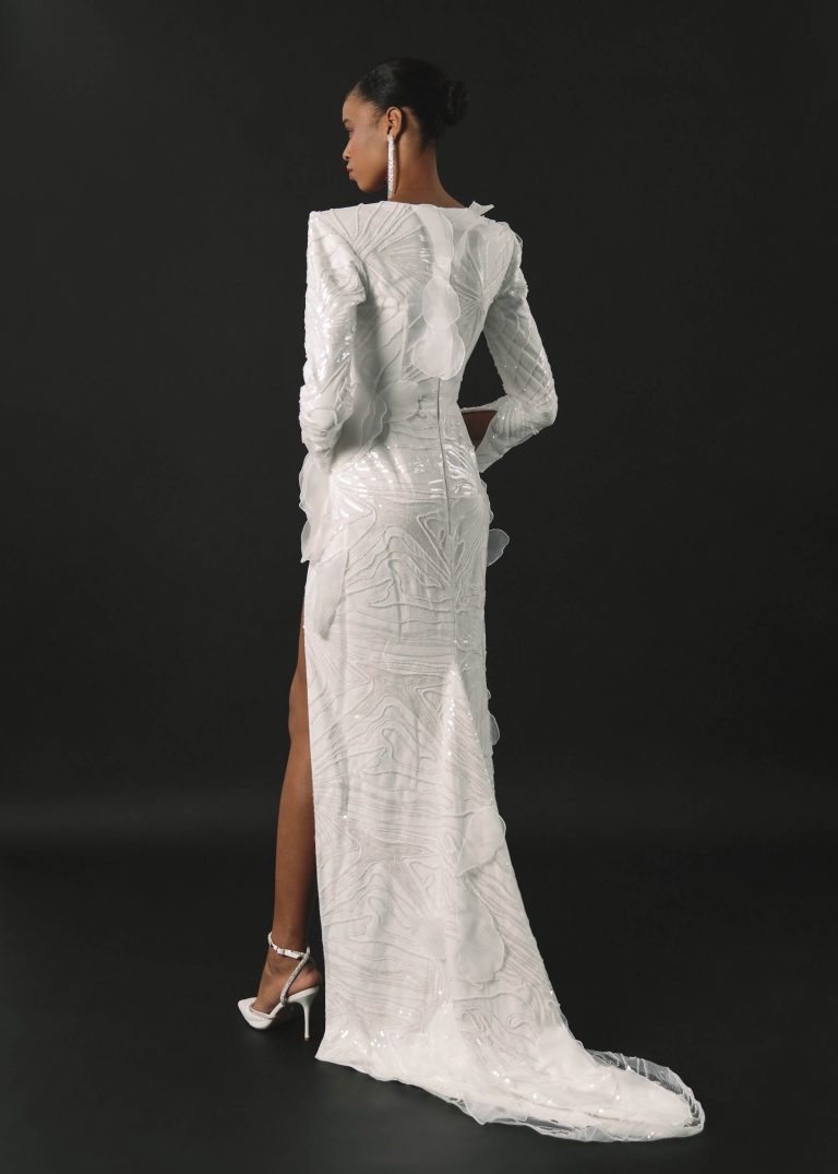 Abito da sposa con corpetto decorato con motivi a rilievo e dettagli in pizzo per un look unico. La gonna lunga, con ampio spacco e strascico, è impreziosita da decorazioni floreali e in organza.