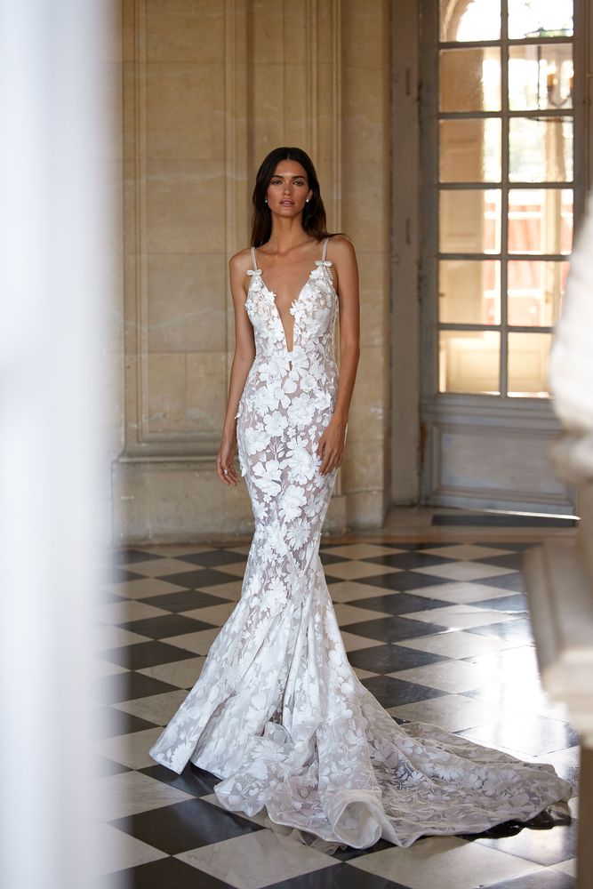 Blair è un abito da sposa a sirena, color avorio e nude, adornato da fiori 3D e interamente realizzato in pizzo. Il corpetto ha spalline sottili di perline e graziosi fiocchi staccabili. Questo modello è caratterizzato da un’audace scollatura profonda sia sul decolleté che sulla schiena. Magico ed indimenticabile lo strascico!