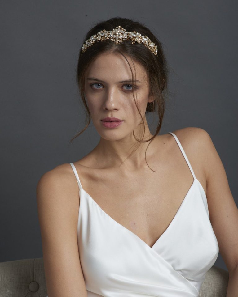 Cerchietto elegante in color oro, decorato con perle e cristalli scintillanti. Un accessorio raffinato per completare l’acconciatura della sposa con luce e delicatezza.