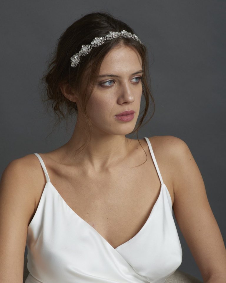 Un elegante cerchietto per acconciatura da sposa, arricchito da cristalli luminosi e ricami floreali in metallo. Perfetto per aggiungere un tocco sofisticato e romantico a qualsiasi hairstyle bridal, dal raccolto morbido al semi sciolto.