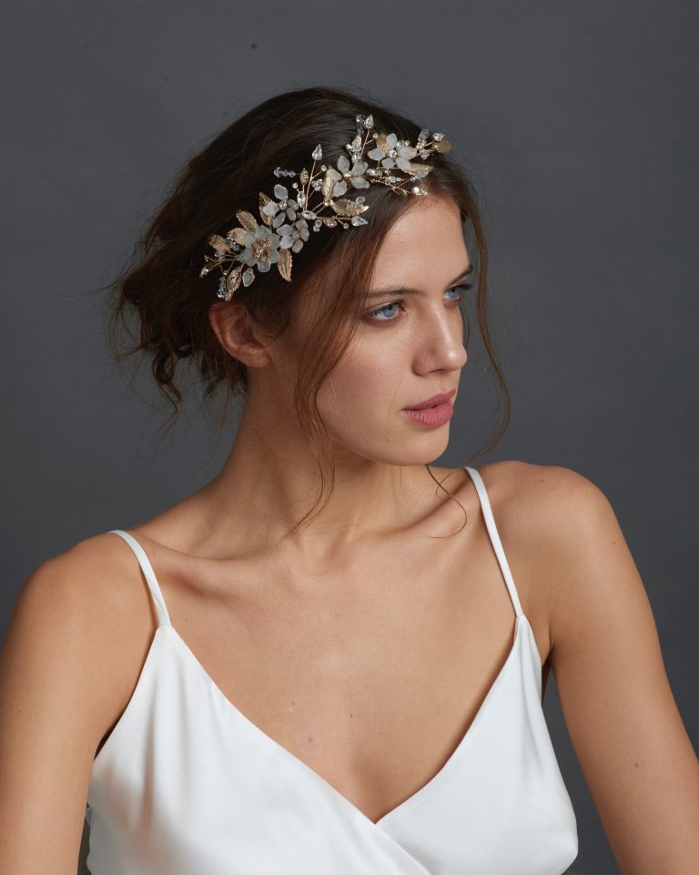 Eleganza e luce si fondono in questo cerchietto dorato decorato con fiori effetto madreperla, foglie metalliche e cristalli luminosi. Un accessorio sofisticato, ideale per acconciature romantiche e look bridal dal fascino naturale.