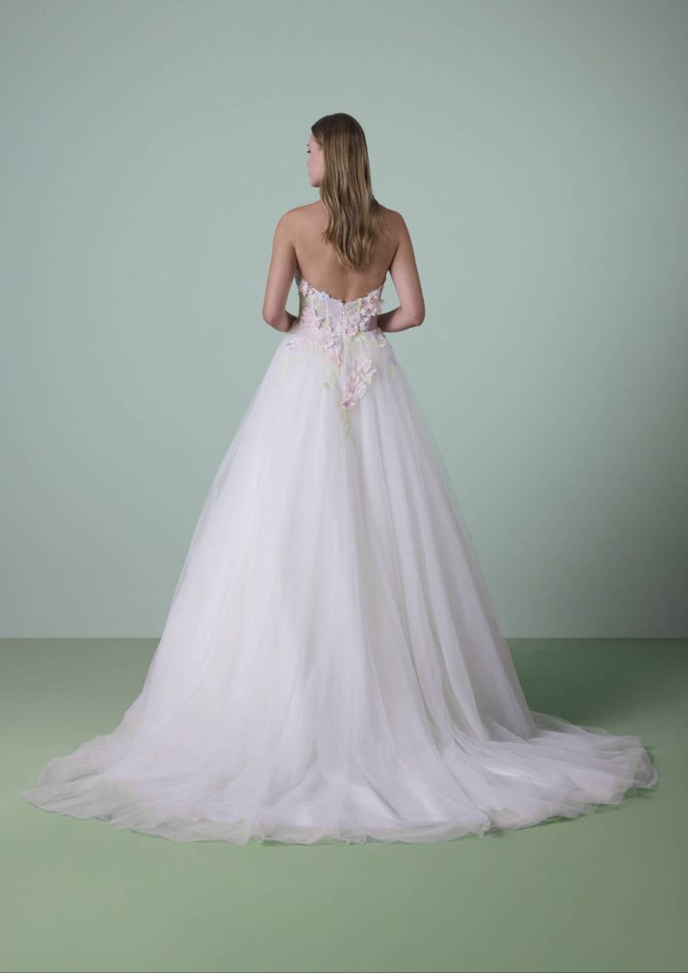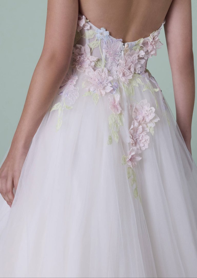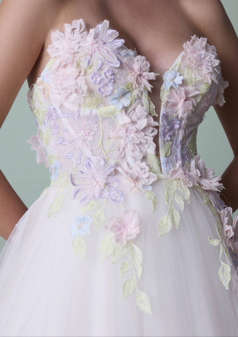 Abito da sposa light pink, realizzato in tulle e pizzo, il suo corpetto è caratterizzato da una magnifica infinita cascata di fiori. Un modello unico nel suo genere!