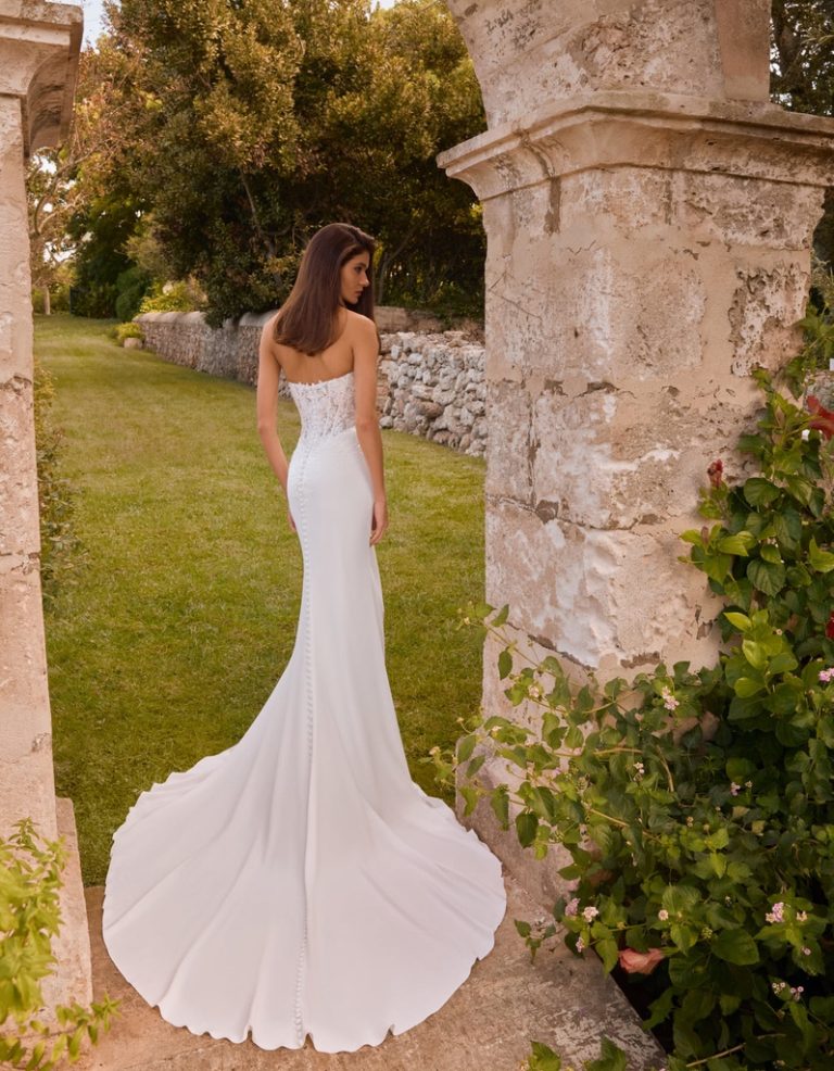 Abito da sposa a sirena dallo stile moderno che abbina un corpetto a corsetto realizzato con applicazioni di pizzo sopra una gonna in crêpe.