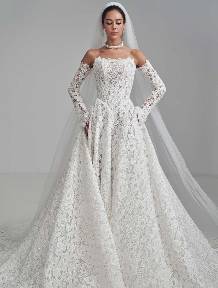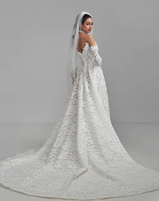 Maestoso e romantico, Claudina è un abito da sposa confezionato in pizzo rebrodé che unisce il fascino regale di una linea principesca alla sensualità delle spalle scoperte. Il corpetto scolpito e le maniche lunghe staccabili donano versatilità e raffinatezza, mentre la lavorazione ricca di dettagli floreali rende ogni passo un’autentica dichiarazione d’eleganza.