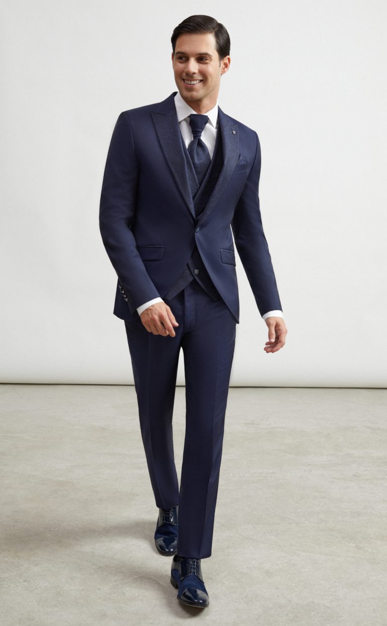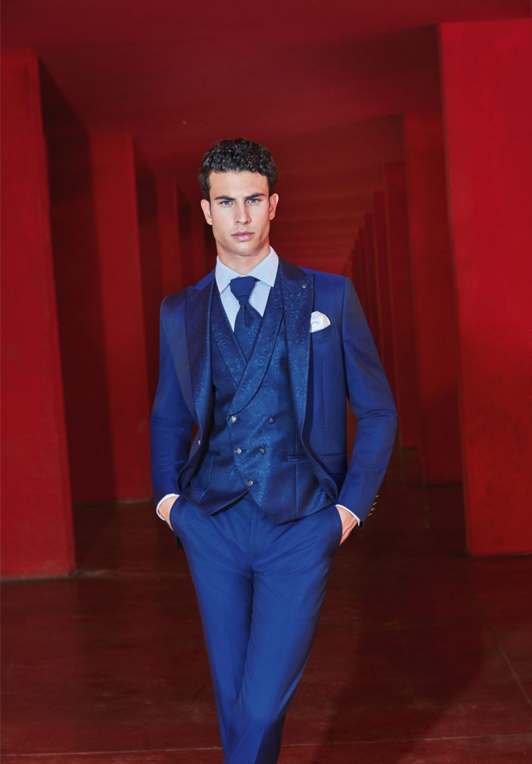 Abito da sposo blu royal con giacca slim fit, gilet coordinato e cravatta blu. Un completo elegante e moderno per lo sposo che ama distinguersi con classe e sobrietà.