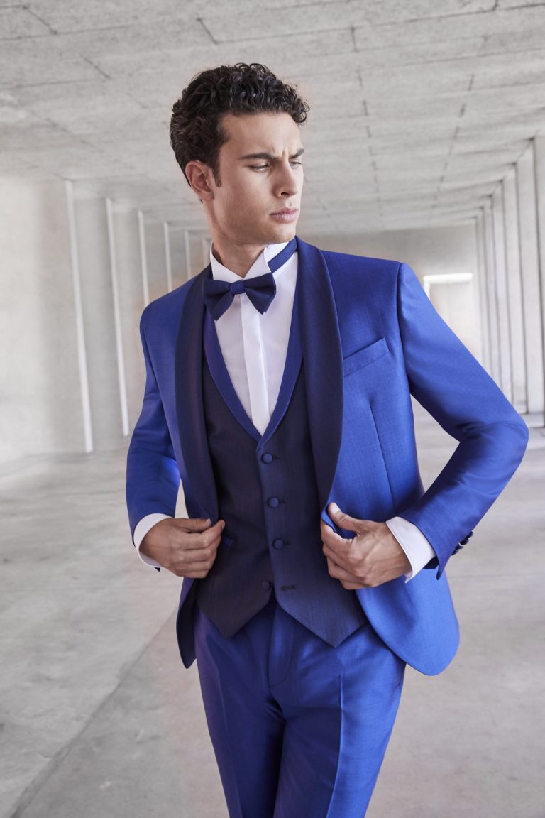 Smoking da sposo blu elettrico con revers nero in raso e papillon coordinato. Un abito moderno e di carattere per lo sposo che vuole sorprendere con stile e personalità.