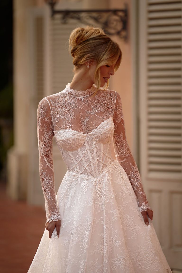 Un abito da sposa dalla presenza scenica impareggiabile, in cui il fascino della scollatura alta in pizzo rebrodé e delle maniche lunghe trasparenti si unisce alla sensualità di un corpetto steccato, leggermente a cuore. La gonna ampia con strascico e sovrapposizione di pizzo francese regala volume e leggerezza, perfetta per una sposa che desidera stupire con grazia senza tempo.