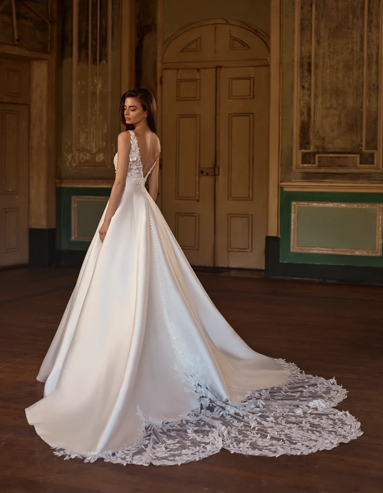 Abito da sposa principessa di stile romantico che abbina un corpetto realizzato con delicate applicazioni in pizzo e cristalli, scollo a V e gonna in mikado con piccola coda in pizzo.