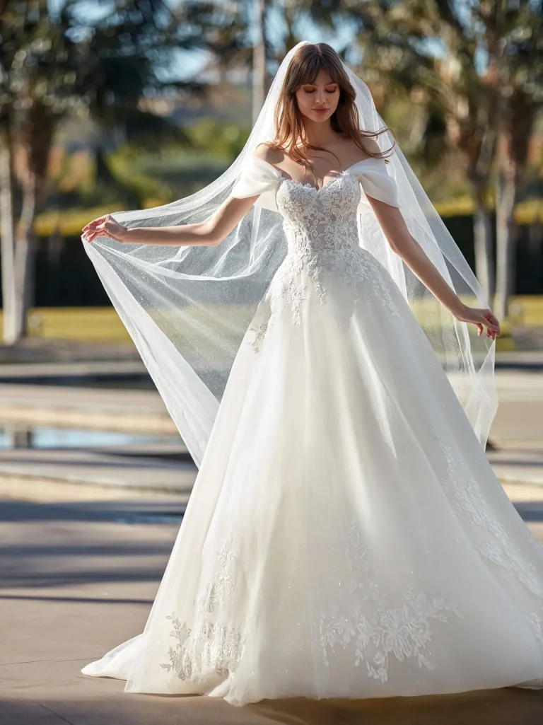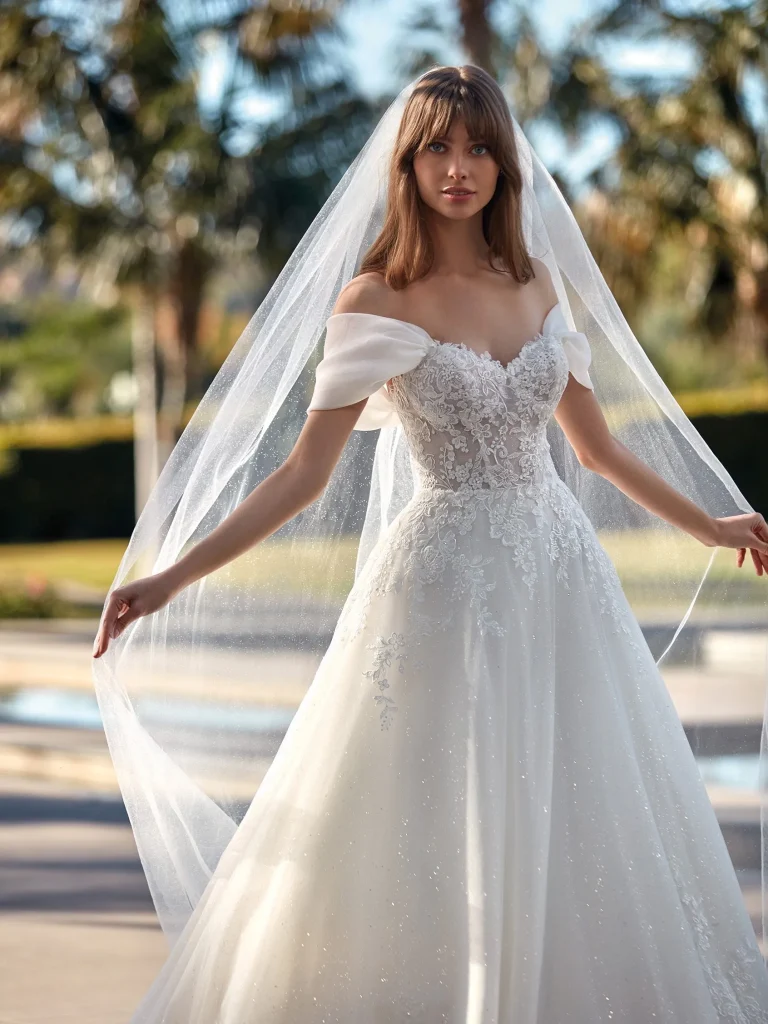 Incantevole abito da sposa con gonna dalla linea ad A in tulle glitter.  Se desideri indossarlo, prenota ora il tuo appuntamento nei nostri Atelier
