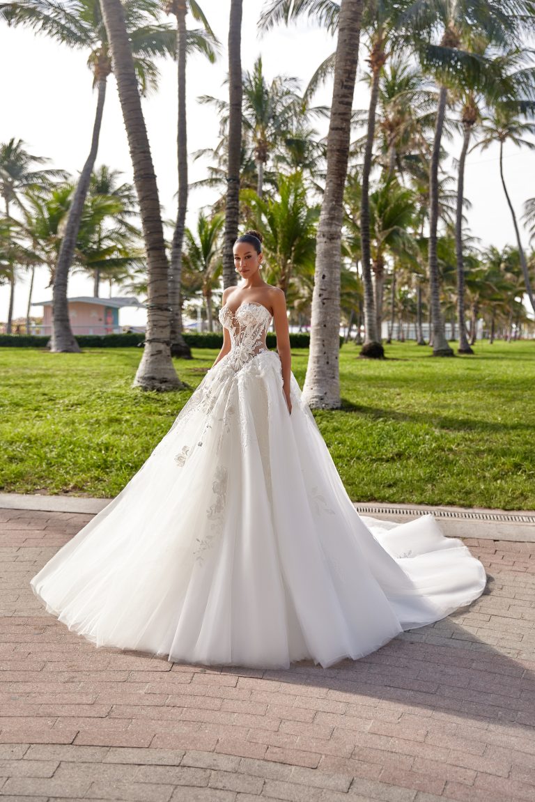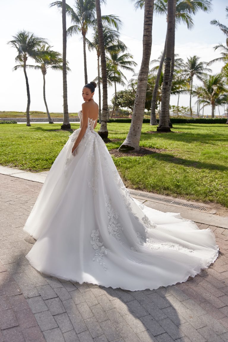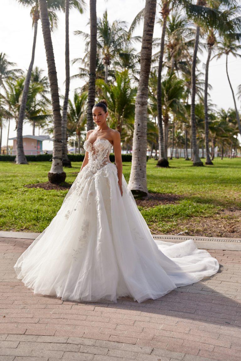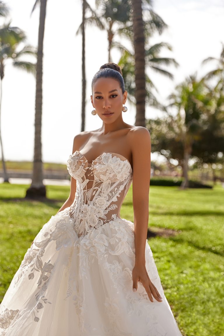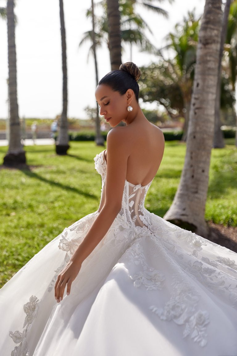 Esma è un abito da sposa da vera favola. Il corpetto scultoreo si apre in una gonna ampia e vaporosa, creando un punto vita leggero come un soffio. Strati di tulle e pizzo si trasformano in raffinati applicazioni floreali 3D, uniche e fresche, illuminate da ricami scintillanti che regalano un’aura di festa. Lo strascico fluente aggiunge un tocco di romanticismo regale. Esma è pensato per la sposa che non sta semplicemente sposandosi, ma sta vivendo il capitolo più magico della sua storia d’amore.