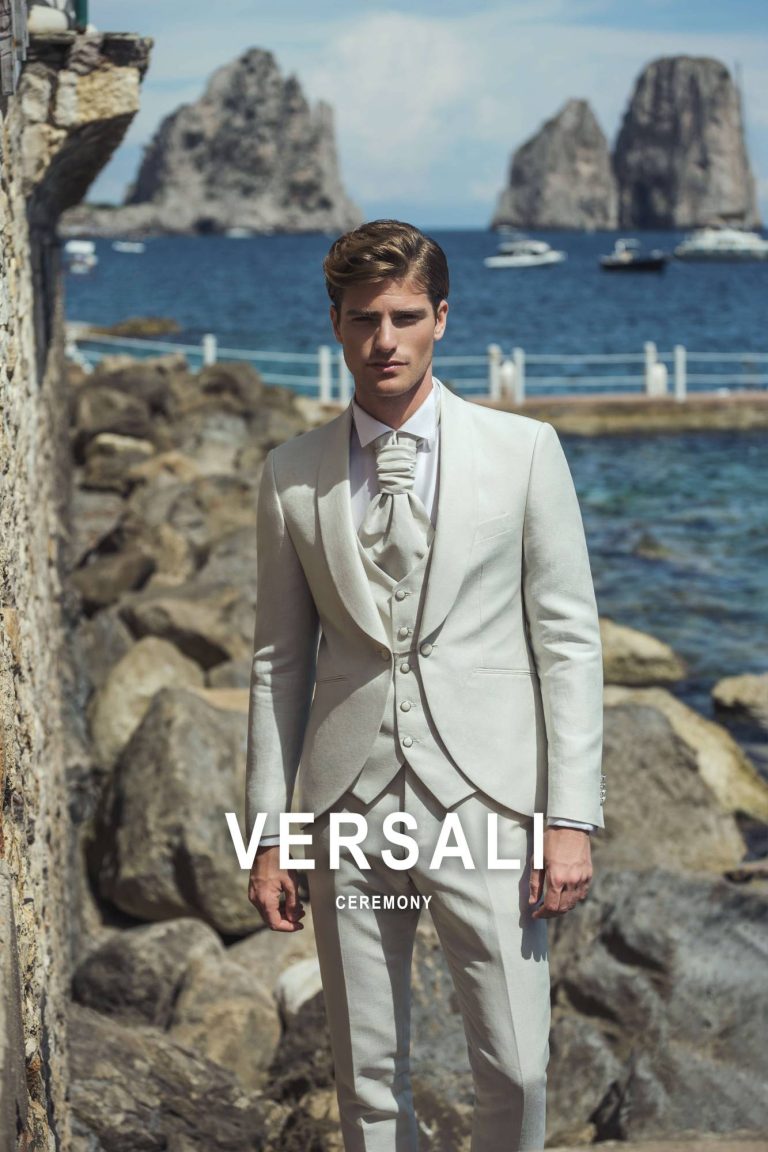Eleganza senza tempo per questo tight moderno Versali, realizzato in tessuto color avorio con rever sciallato tono su tono. La giacca slim fit dal taglio arrotondato si abbina al gilet coordinato con bottoni rivestiti e al plastron panna, creando un look raffinato e sofisticato. Perfetto per lo sposo che desidera un abito cerimonia di grande impatto, con classe e personalità.