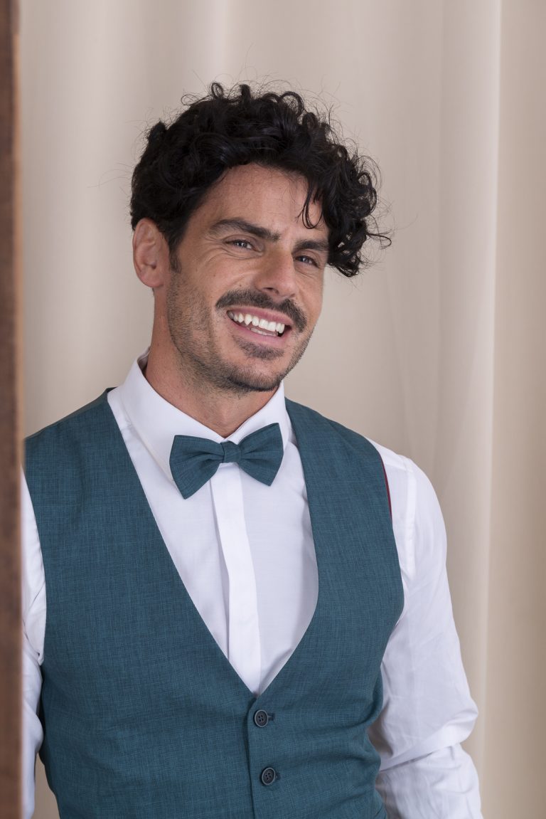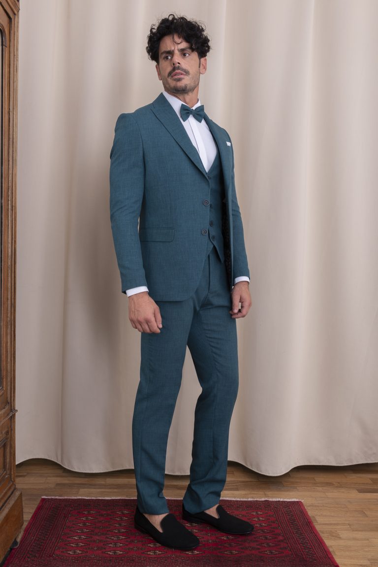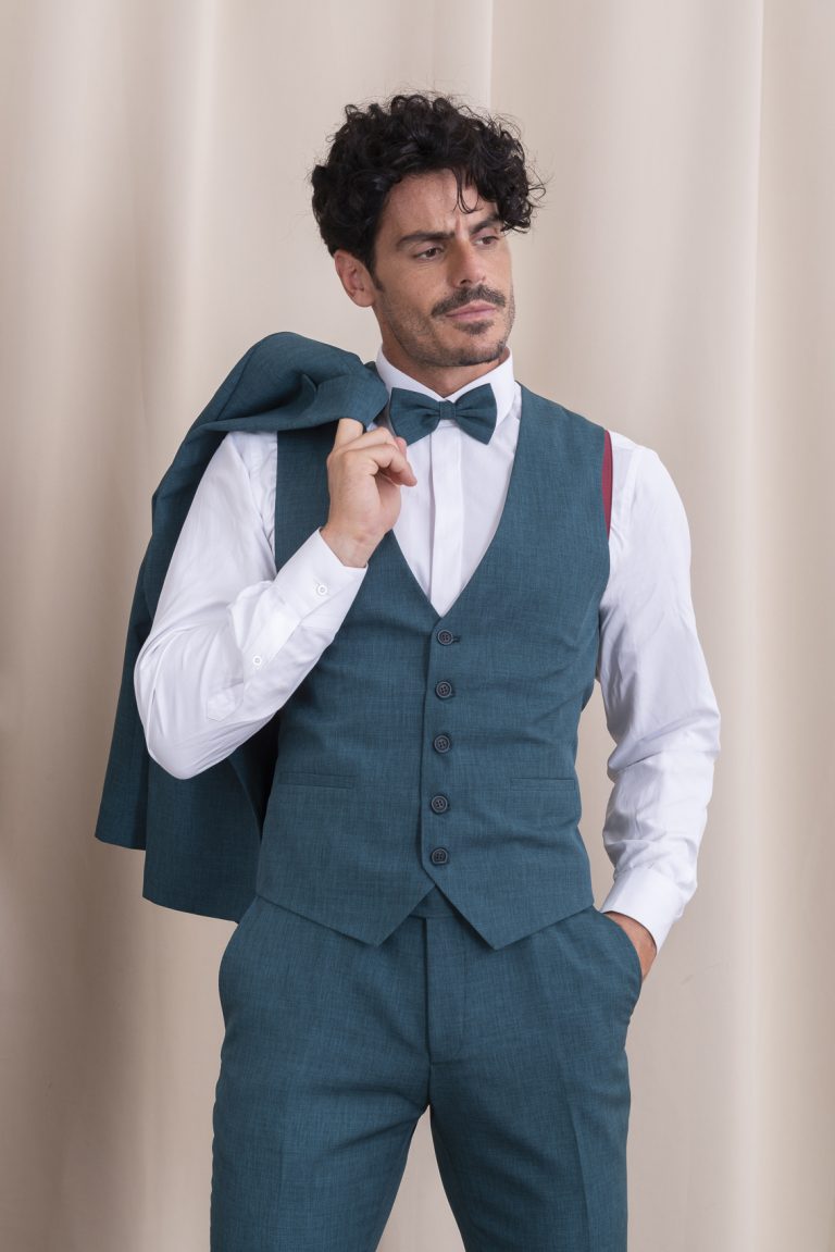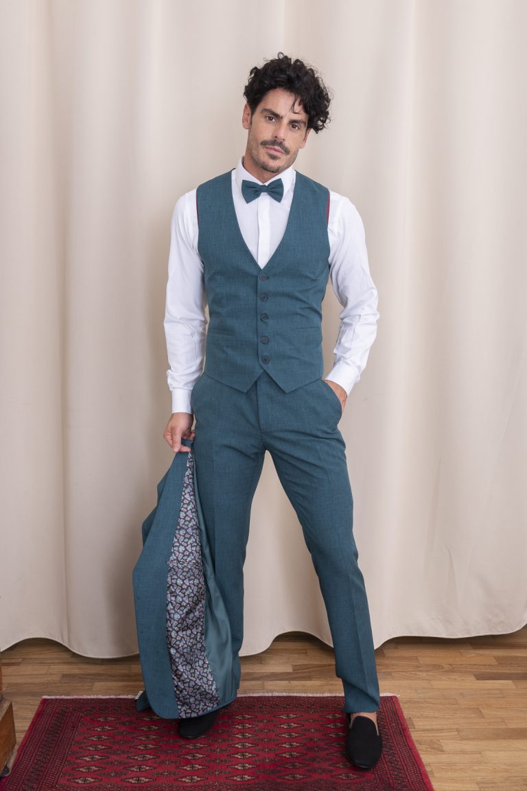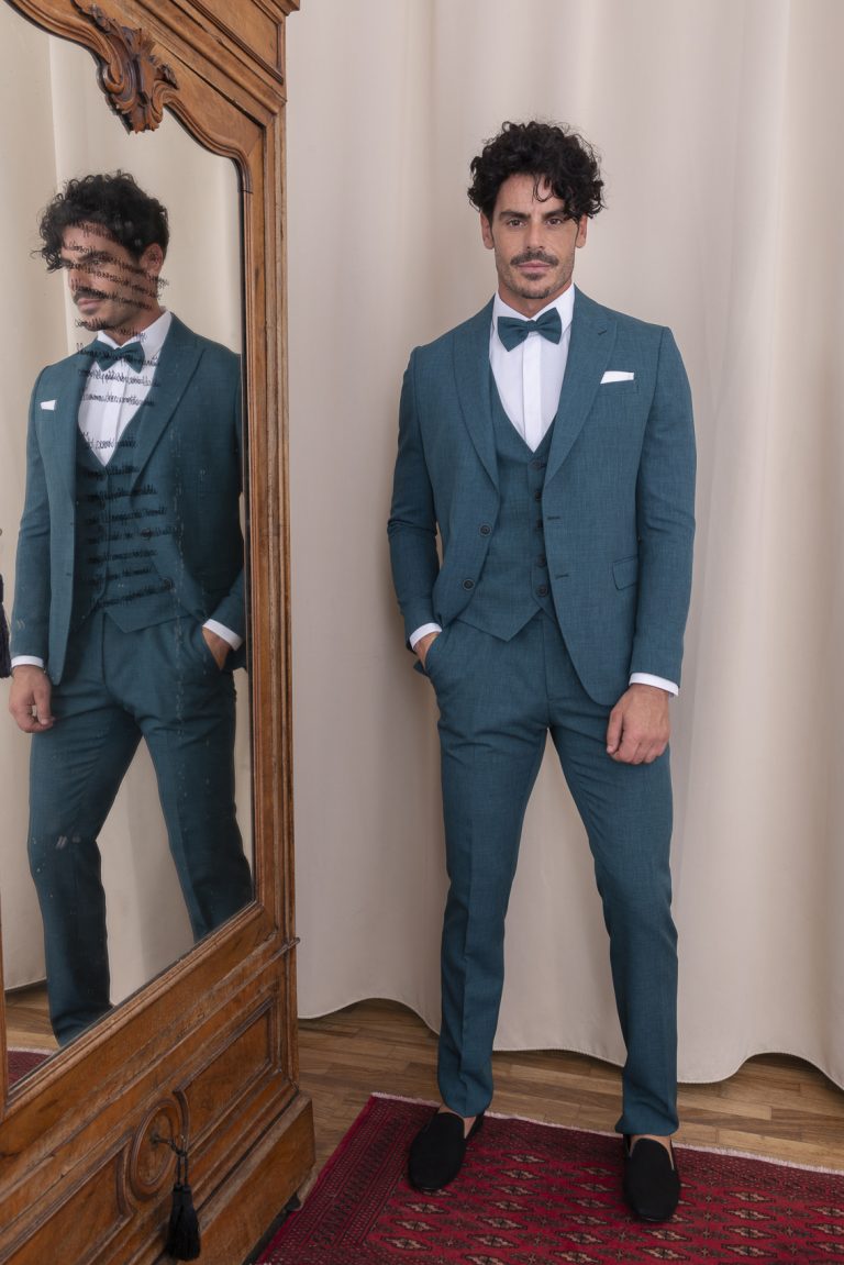 Abito da Sposo in misto lino color verde ottanio, giacca a due bottoni e gilet monopetto. Un completo molto giovanile e di tendenza!