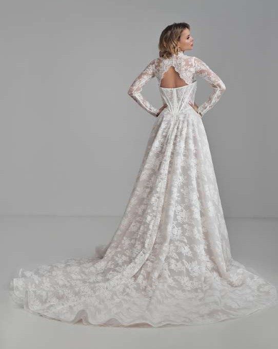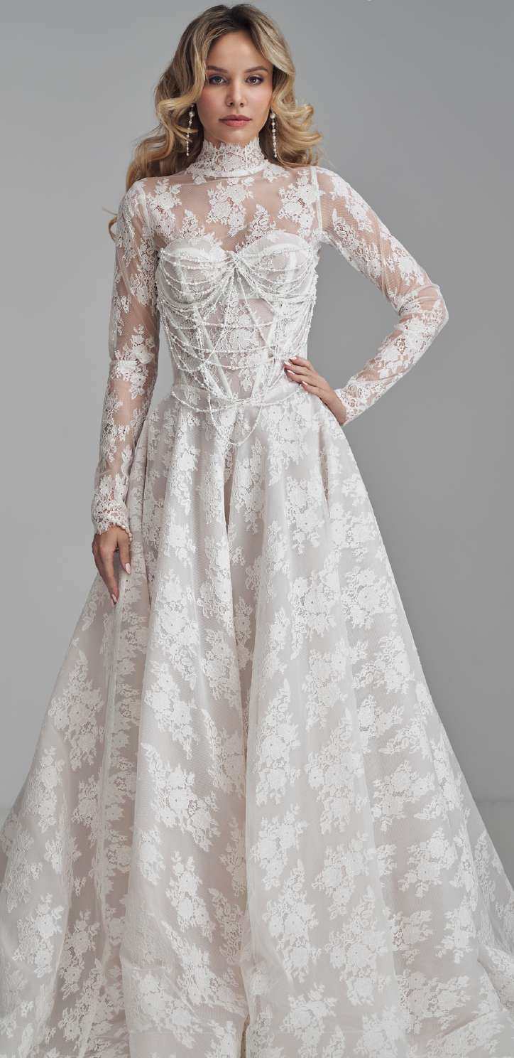 Il corpetto strutturato con stecche a vista e drappeggio di perline crea una silhouette scultorea e femminile, mentre il collo alto in pizzo e le maniche lunghe aggiungono un tocco regale.