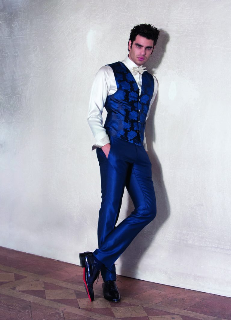 Uno degli abiti da sposo uomo più innovativi, che rielabora la giacca di Charlie Chaplin e propone un abito da sposo uomo couture unico.