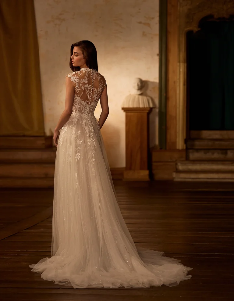 Abito da sposa linea A di stile romantico che abbina un corpetto con collo alto e delicate applicazioni di pizzo a una gonna in tulle.