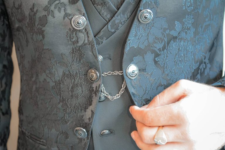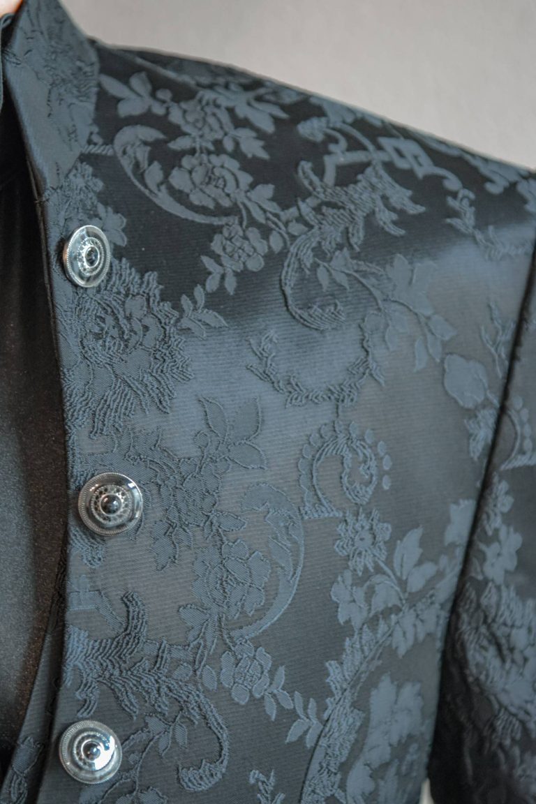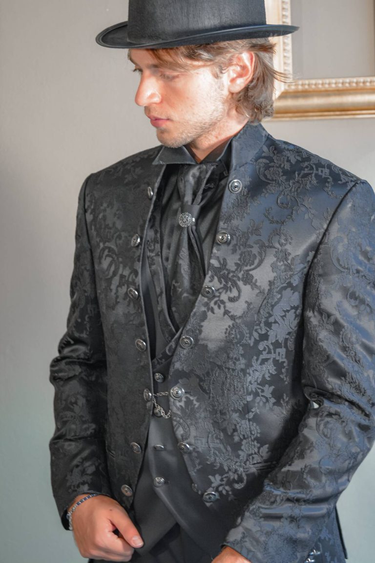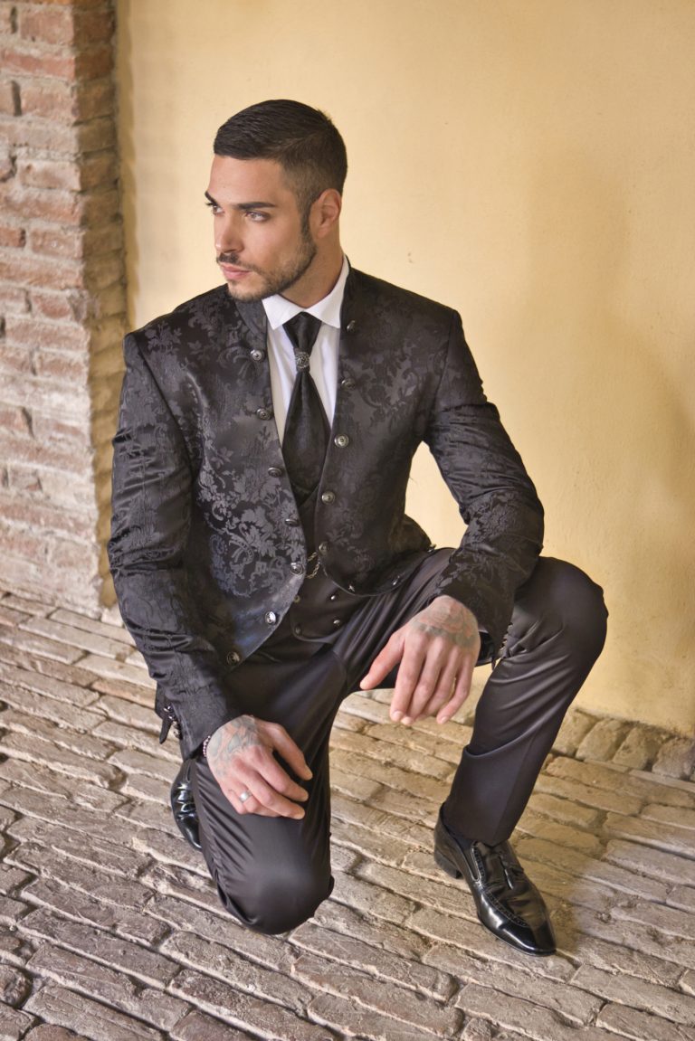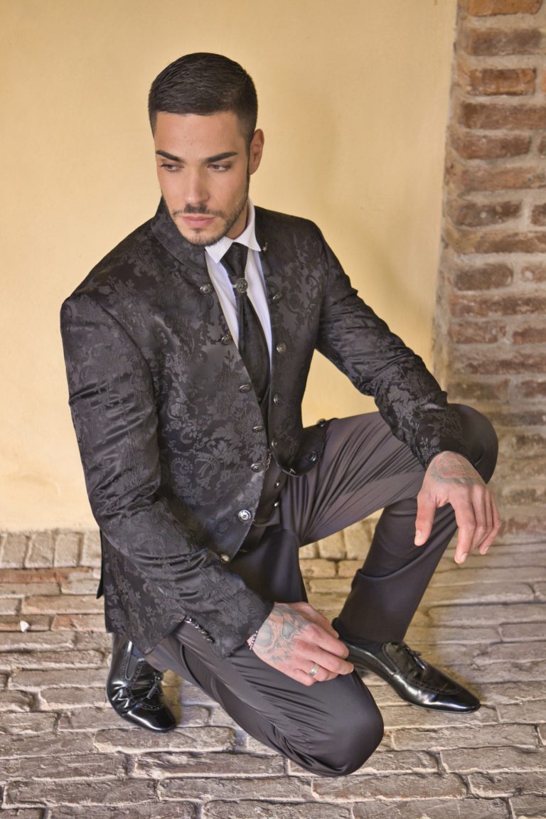 Scopri il modello Marco Aurelio, un abito da sposo con giacca coreana damascata, disponibile sia in nero che in blu.