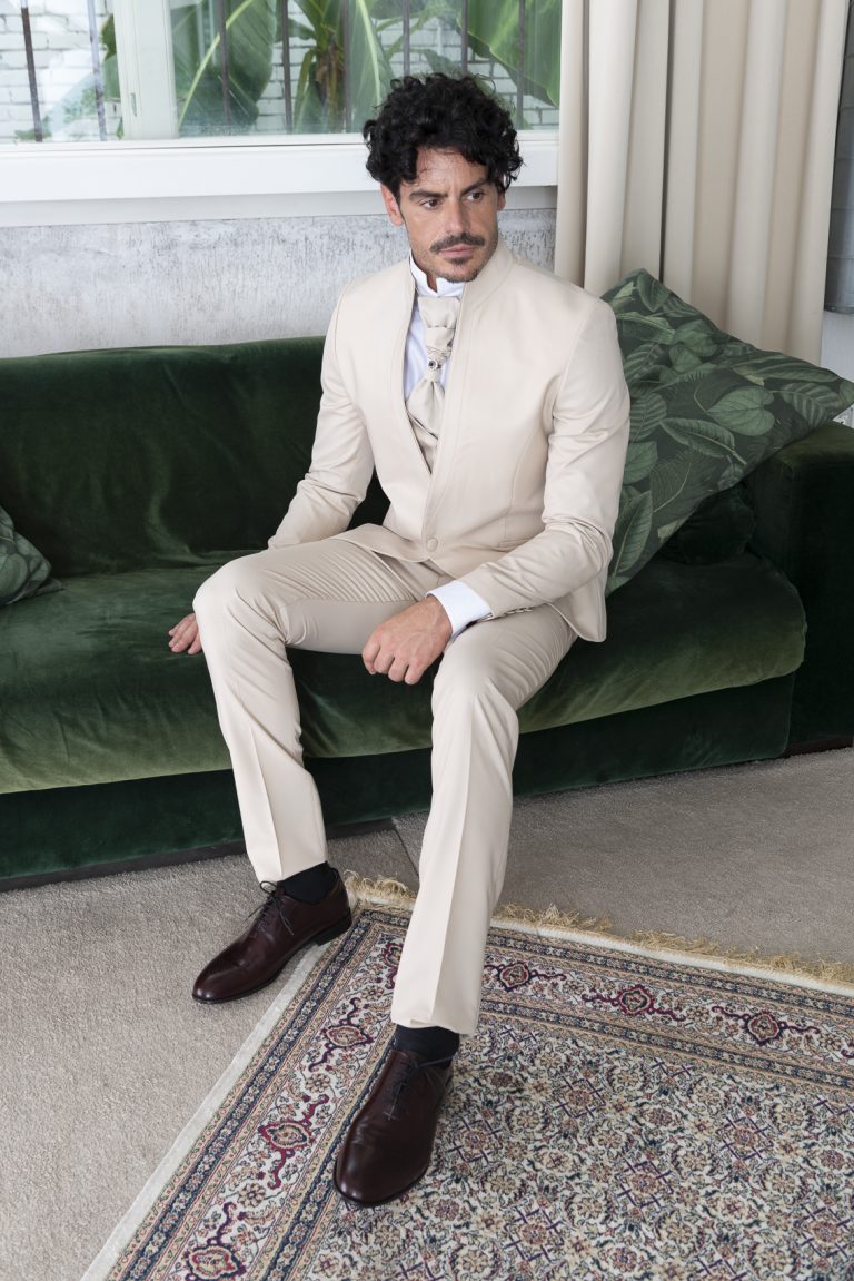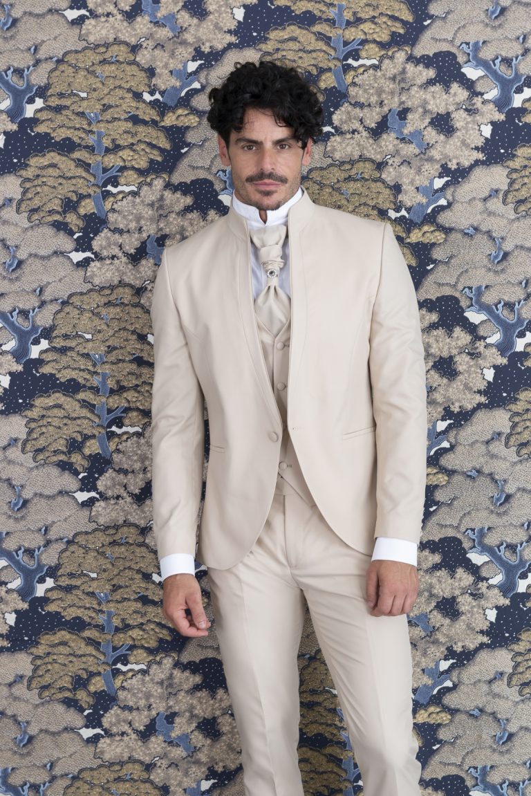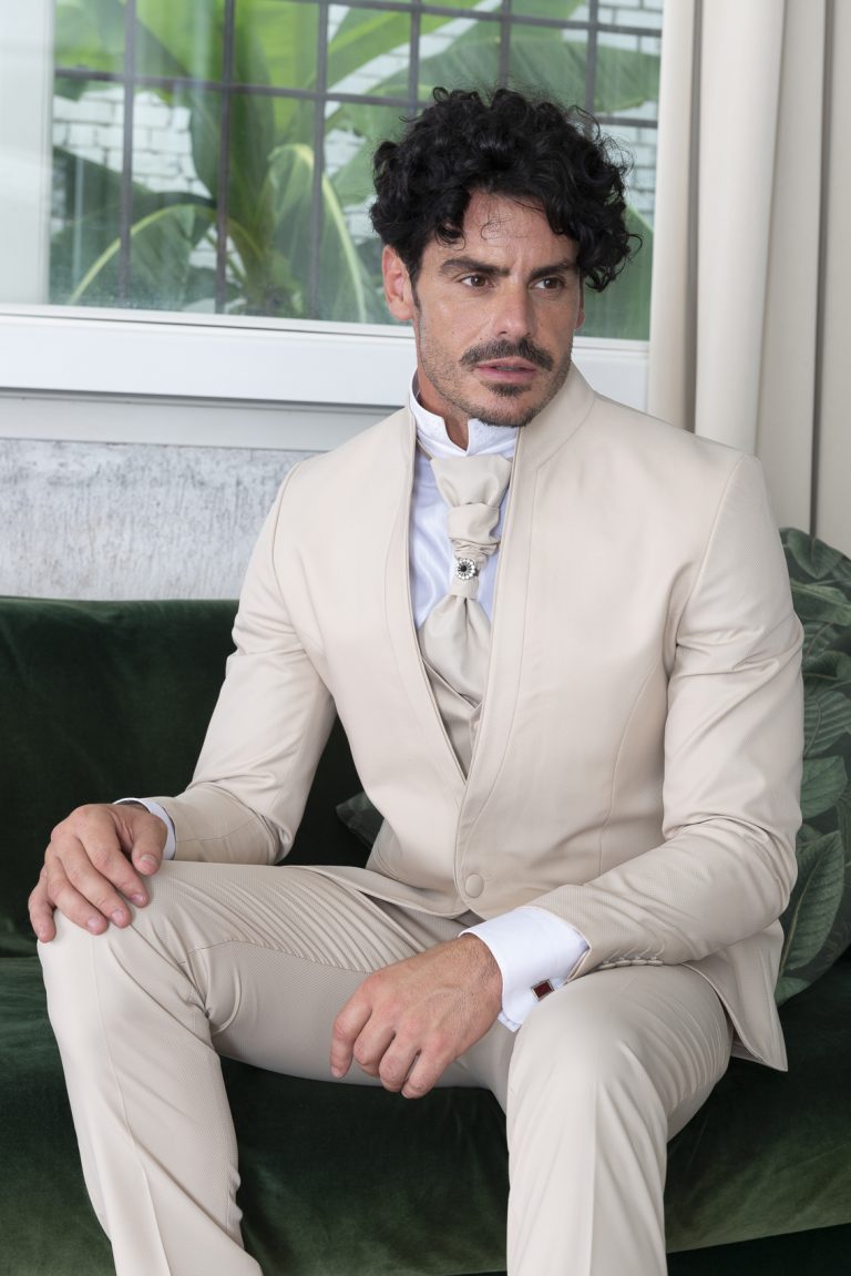 Andrea Casalino indossa il nostro abito da sposo coreana, realizzato con tessuti di alta qualità, in color sabbia chiaro.