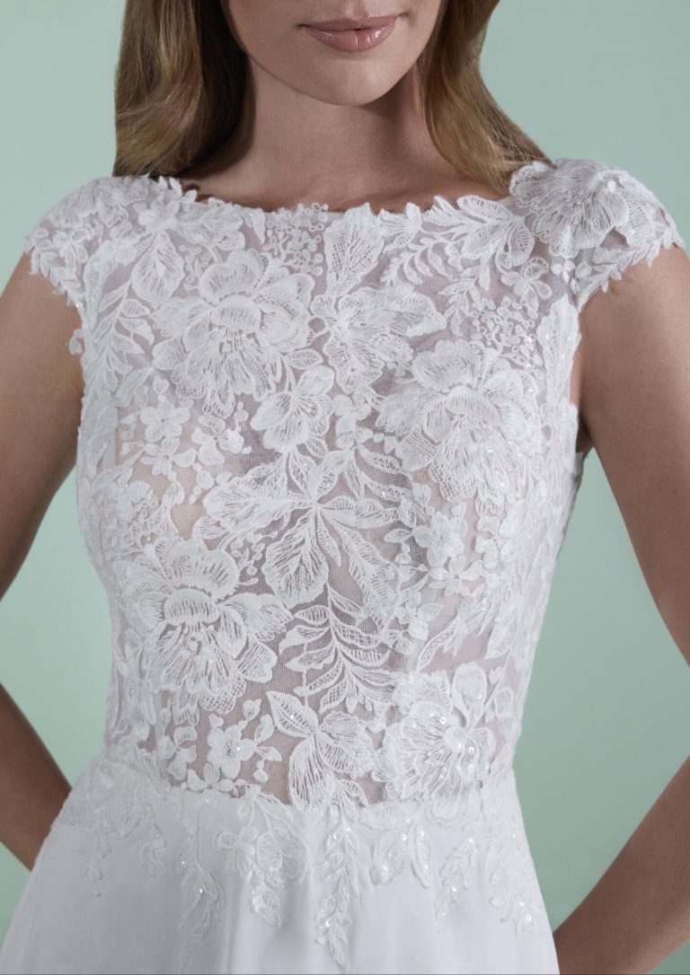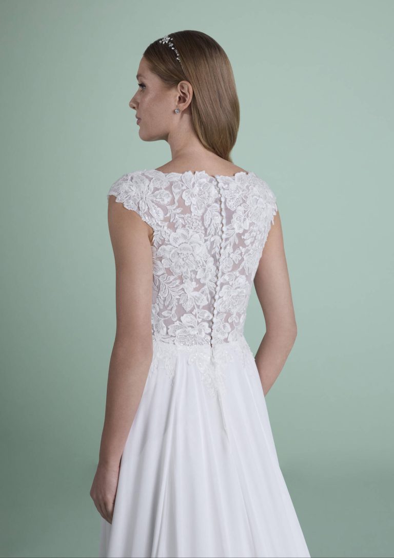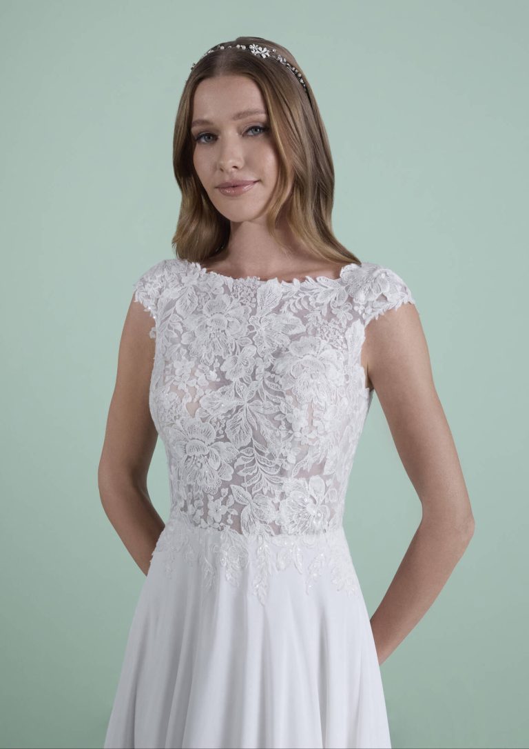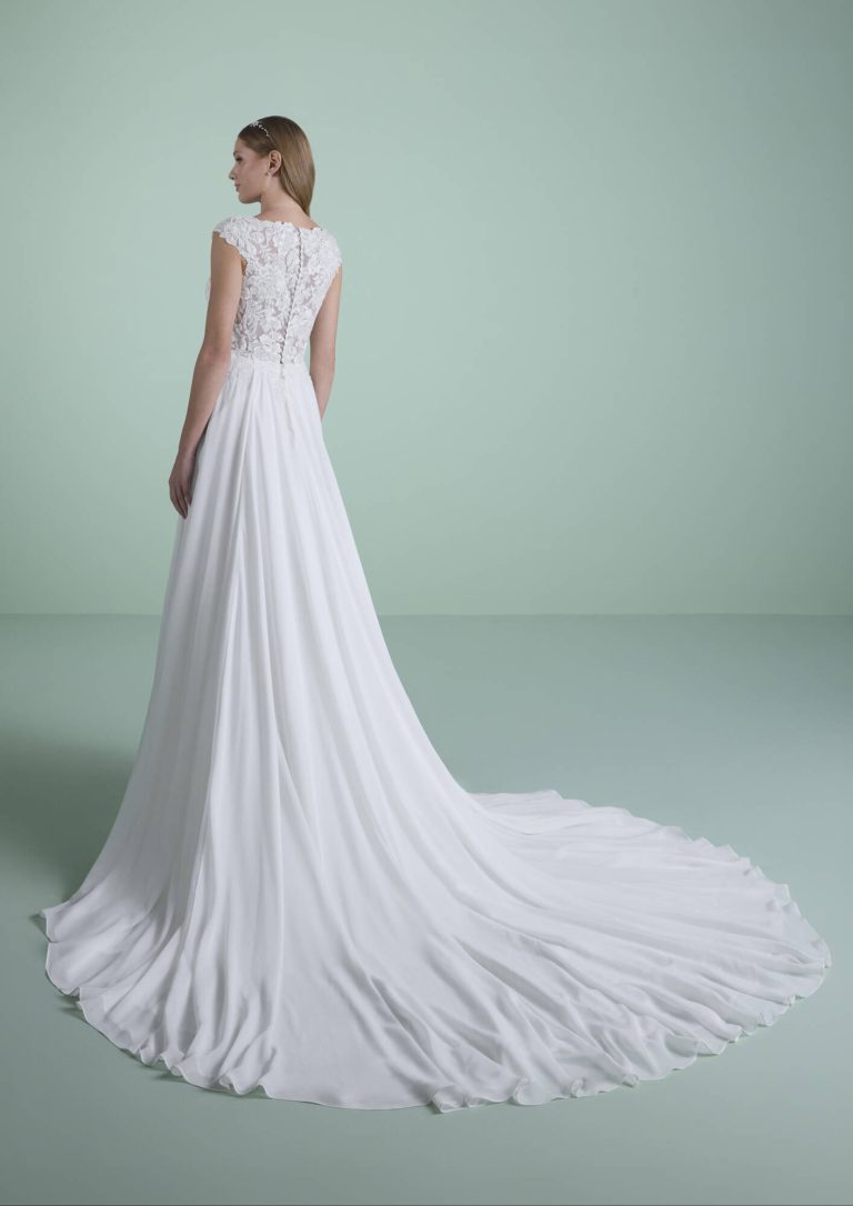 Minthe è semplicità pura, questo abito da sposa dalla linea ad A fluida è caratterizzato da un corpetto in pizzo ricamato con decorazioni di perle e presenta un décolleté a girocollo e maniche corte. La gonna di chiffon mostra una caduta spettacolare fino alla coda cattedrale.