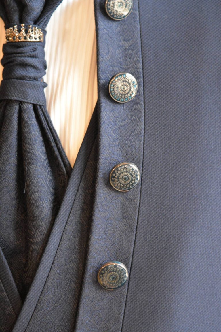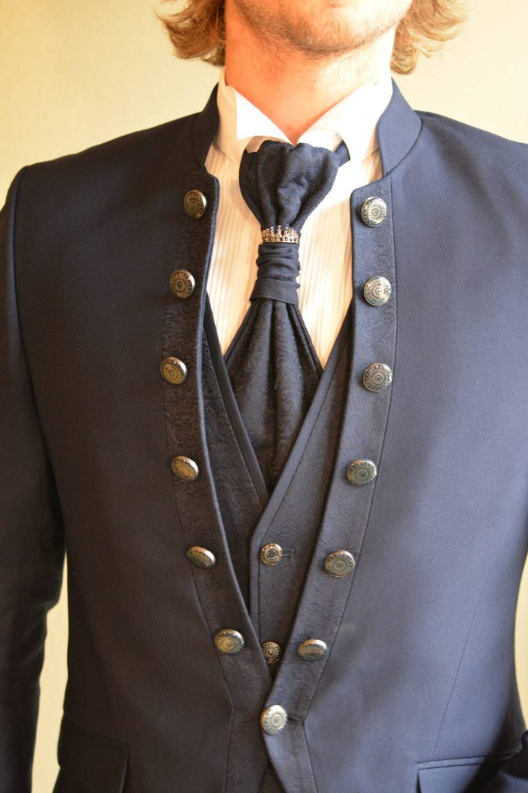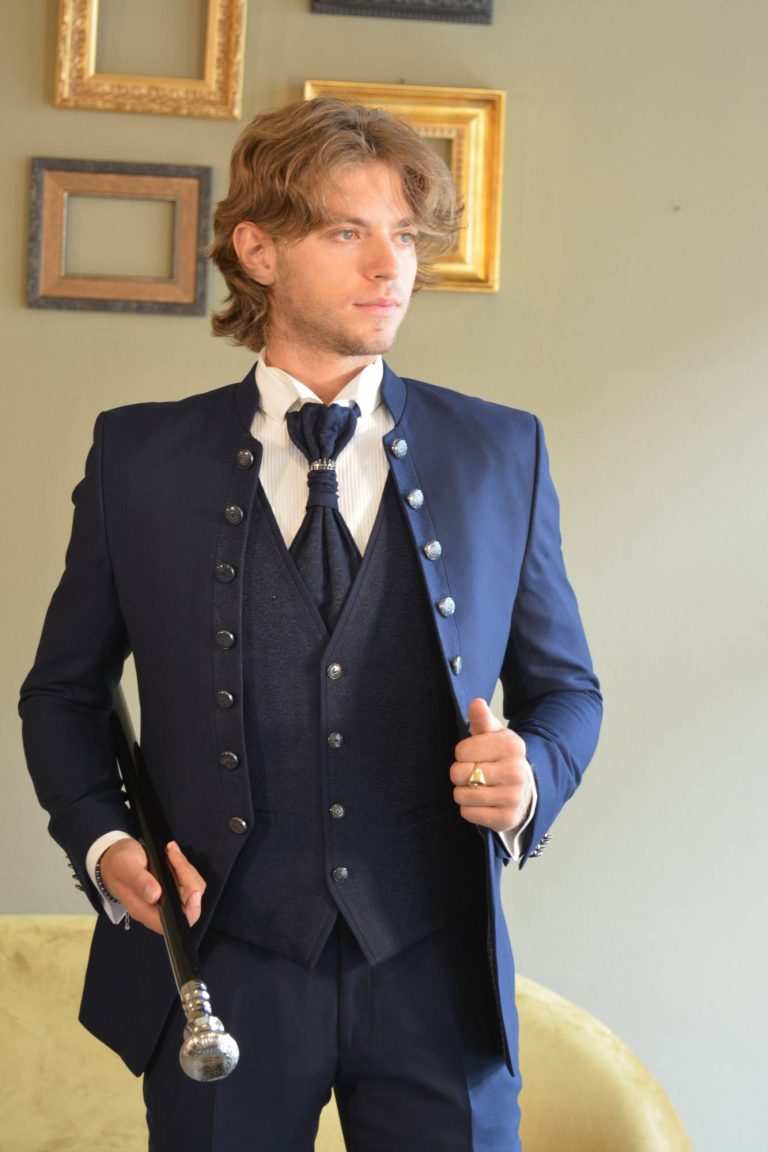 Coreana slim fit con profili in jacquard. Un abito da sposo alla moda e giovanile.