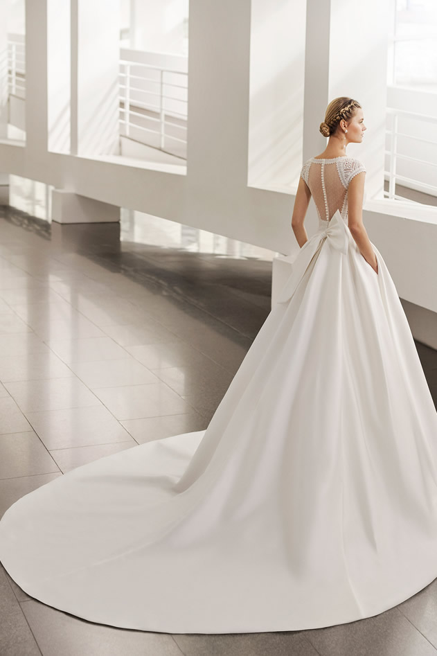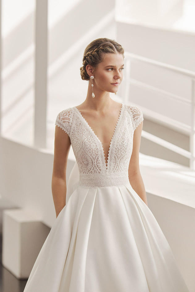 L’abito da sposa Norber è un perfetto equilibrio tra romanticismo e sobrietà. Il corpino in pizzo ricamato con scollo a V e maniche ad aletta si fonde con una maestosa gonna in mikado dalla linea svasata, arricchita da tasche laterali e un lungo strascico.
